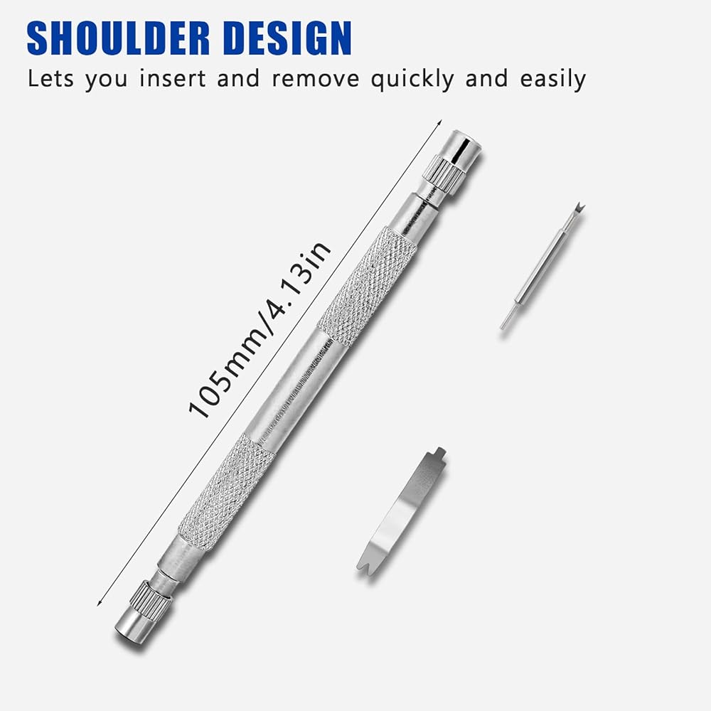 NON-SLIP DESIGN - The watch tool kit has a non-slip design to avoid slipping during use and a double shoulder design for easy removal or installation. The end pins at both ends can be removed and replaced.The pin tips are covered with silicone caps.