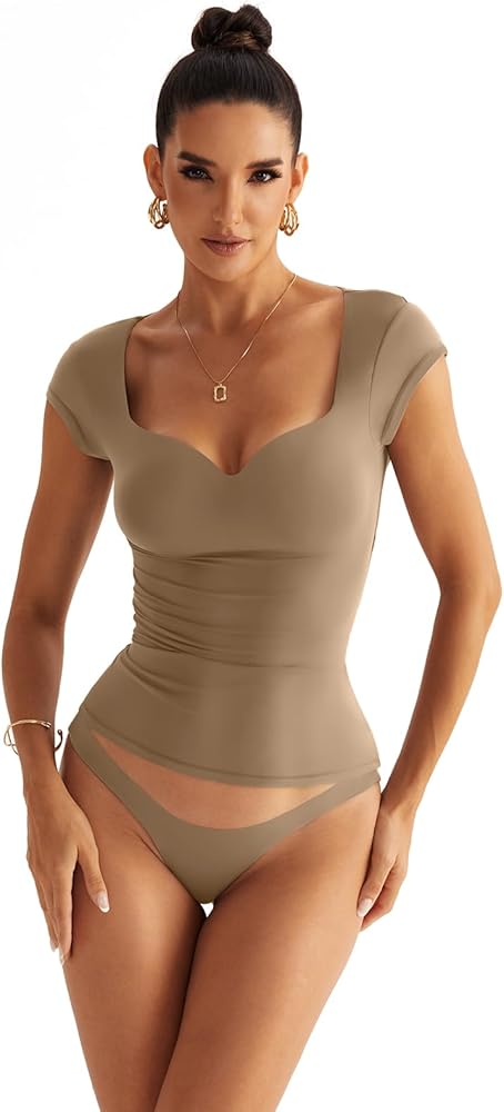 Heart Neckline Top: Sweetheart neck casual shirts, full body elasticity cap sleeve top for women, slim fit tight shirts, second-skin feel, no compression;