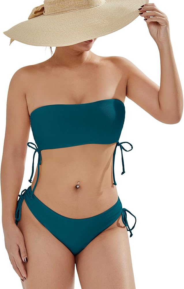 The Bandeau bikini set features with ruched bikinitop and high cut cheeky tie sides bottom, so it makes you look more charming and sexier, perfectly show off your curve.