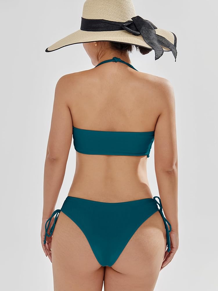 There are Two ways of wearing, you can adjust the straps to Halter style or tie side for Bandeau Bikini. Special textured fabric add more charming for hot summer look.