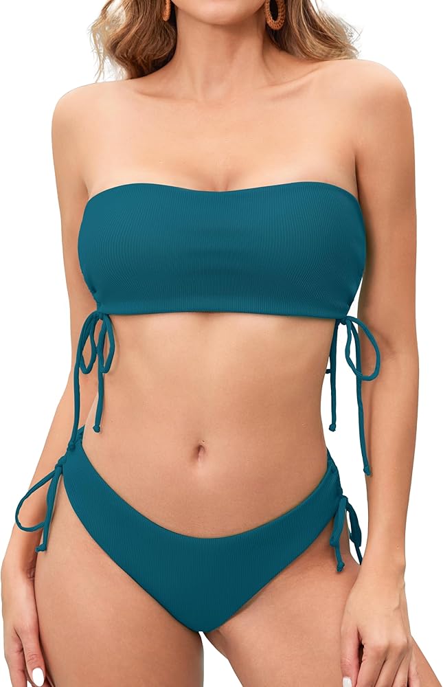 Feature: Bandeau Bikin Set,strapless Tanga Bikini,Convertible Halter swimsuit, removable padded, solid color, Bandeau bikini top and string tie sides bottom.
