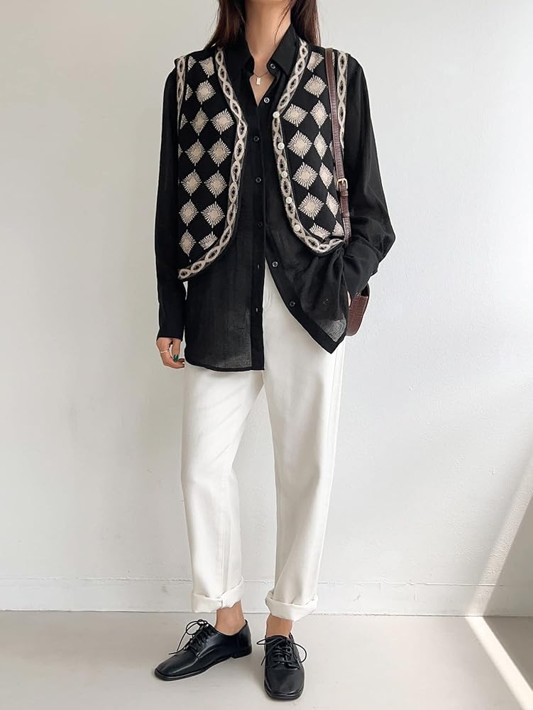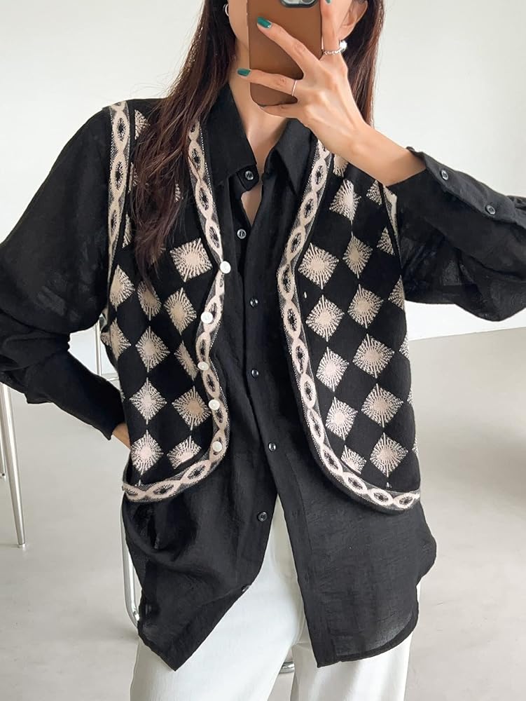 - Feature: Knit, v neck, button front, checkered pattern, sleeveless cardigan vest