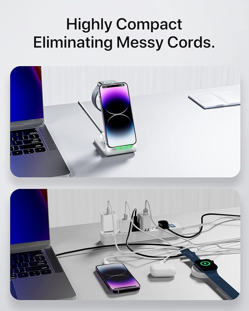 【Latest upgrade】The Qi-certified wireless charger stand with upgraded design and internal chip ensures safe and fast wireless charging. One charging device for your iPhone, iWatch, and Airpods. Suitable for home and office usage.
