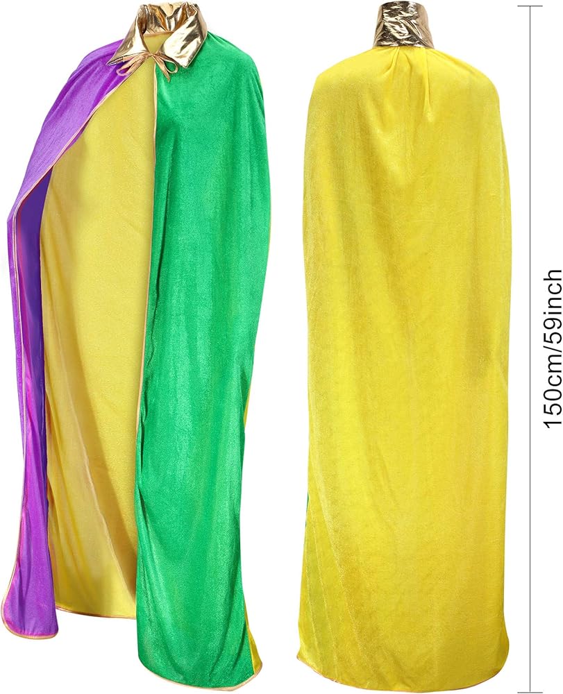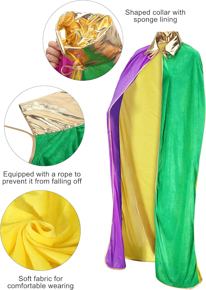 The full-length cloak with 3 vibrant colors, include purple, green and gold, soft velvet material is very comfotable to touch, and the neck is designed with a strap to prevent it from falling off, put on this cloak to make you look more eye-catching.