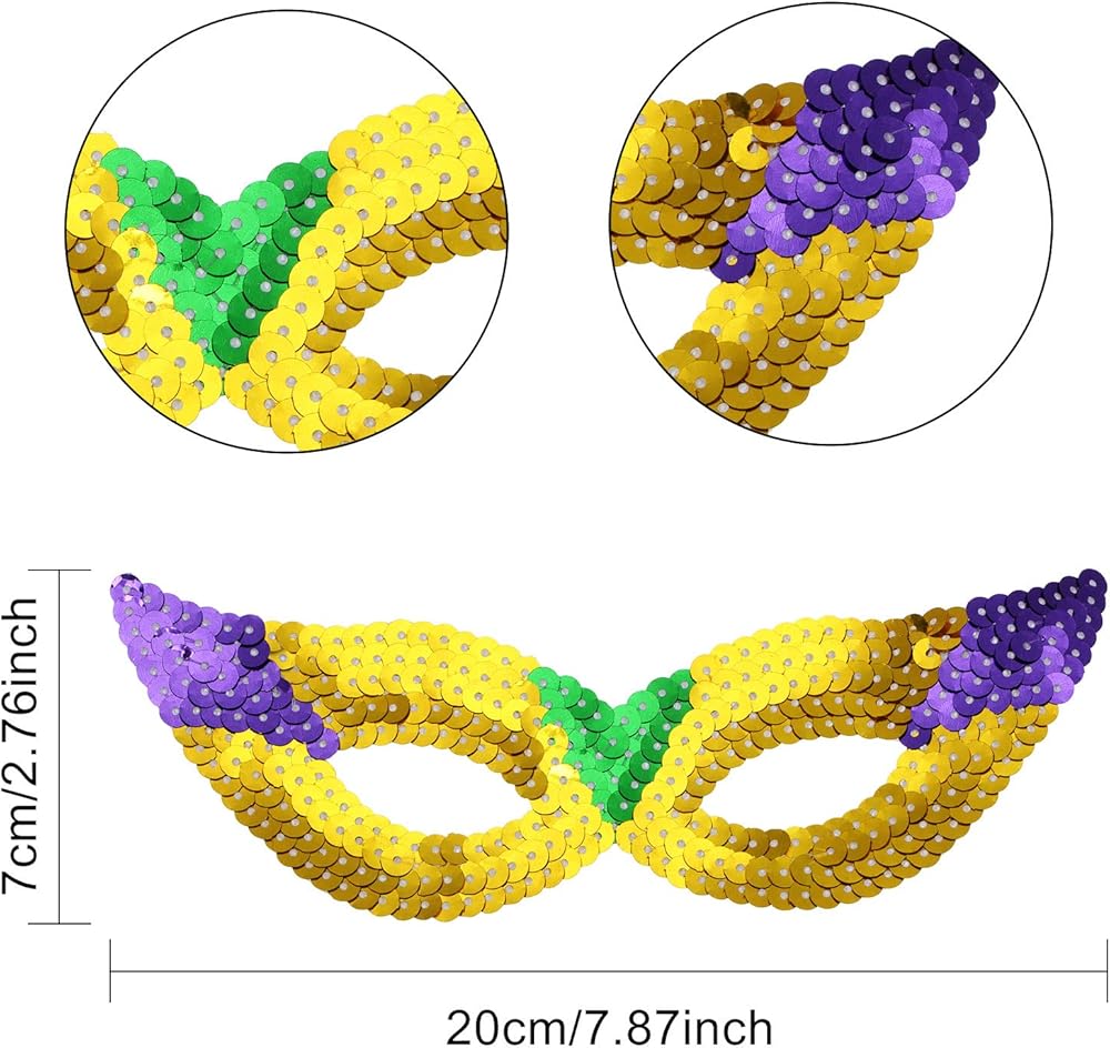The mask is decorated with purple, yellow and green sequins, the size is approx. 20 x 7 cm/ 7.87 x 2.76 inches, you can tie the mask on your head with elastic rope, you will looks more mysterious.