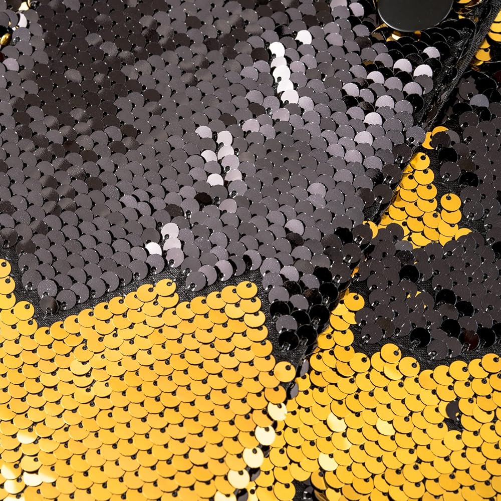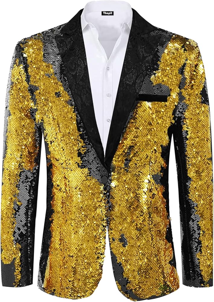【Quality Material】Intricate design and meticulous construction make this a must-have in your suits collection. Comprised of reversible sequin fabric and engineered for superior durability and comfort. The jacket have lining, and the fabric is comfortable. The cuff is covered with edges, which is perfectly spliced. There is no need to worry about the discomfort caused by sequins touching the skin. This just will become your new favorite piece.