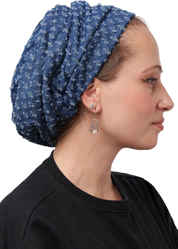 Religious women wear this Israeli tichel at home, out with friends, or at the gym. This beret is a good choice for religious women covering their hair.