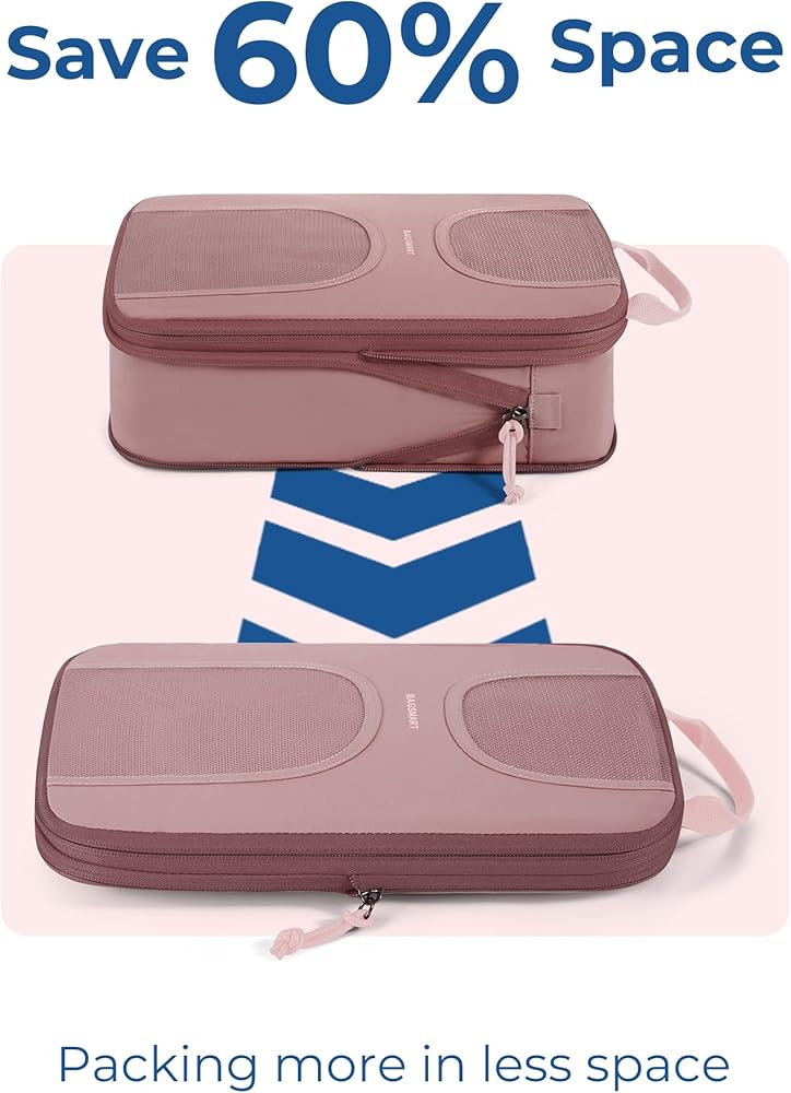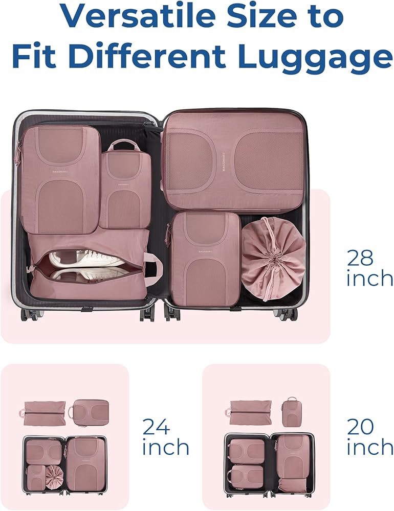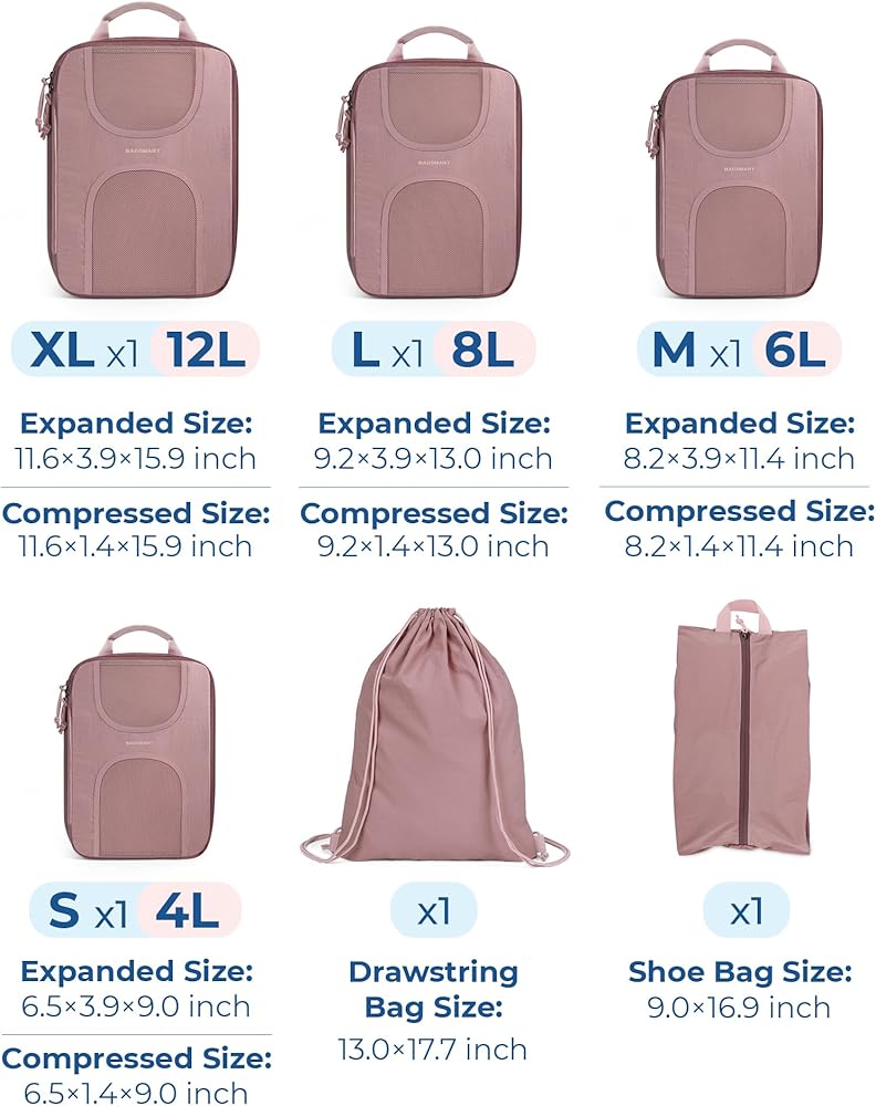 KEEP PACKING ORGANIZED: BAGSMART 6 set compression packing cubes includes 1 extra large cube (11.6'' x 15.9''), 1 large cube (9.2'' x 13''), 1 medium cubes (8.2'' x 11.4''), 1 small cubes (6.5'' x 9.0''), 1 drawstring bag (13.0" x 17.7") and 1 shoe bag (9.0" x 16.9"). Different sizes can be used for different packing purposes, helping us quickly sort, organize and find our items while traveling. Say goodbye to messy suitcases and keep your clothes organized.