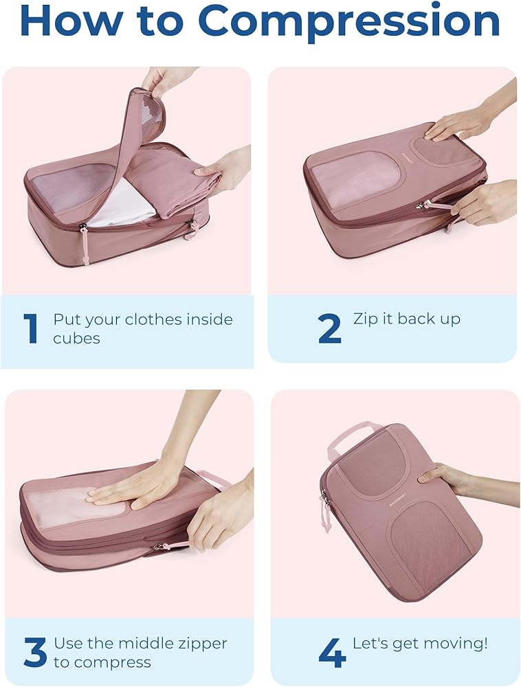 SAVE 60% SPACE: Just like how a vacuum sealer works. With our compression travel cubes, you can easily compress clothing and other essentials into a compact shape, freeing up to 60% of luggage space. Imagine being able to hold twice as much stuff in your luggage without compromising on style or comfort. Whether you're planning a weekend getaway or a trip around the world, our storage bags are a must-have solution for savvy travelers like you.