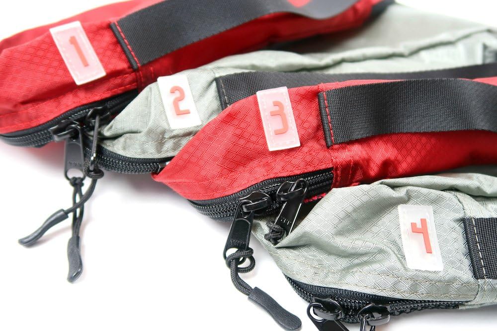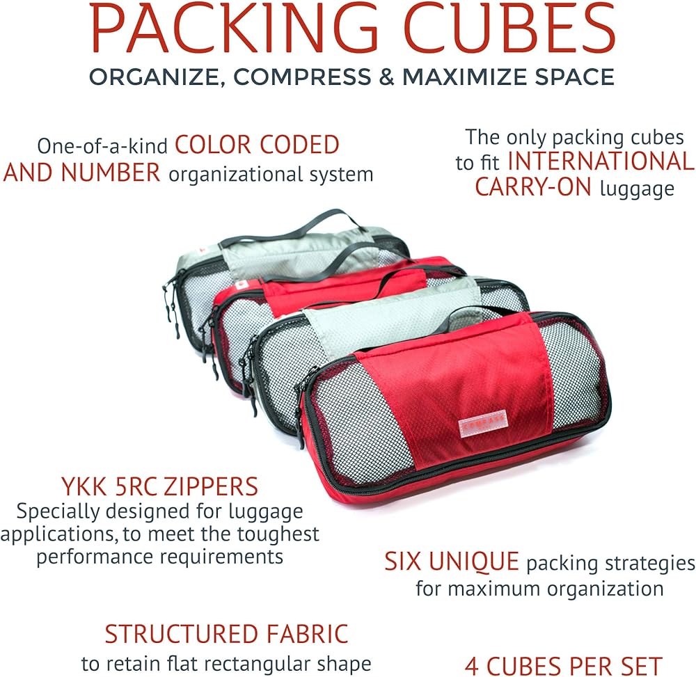 There are four packing cubes in each set. Each set has two grey and two red packing cubes and each cube features a number from one to four allowing you to maximize organization.