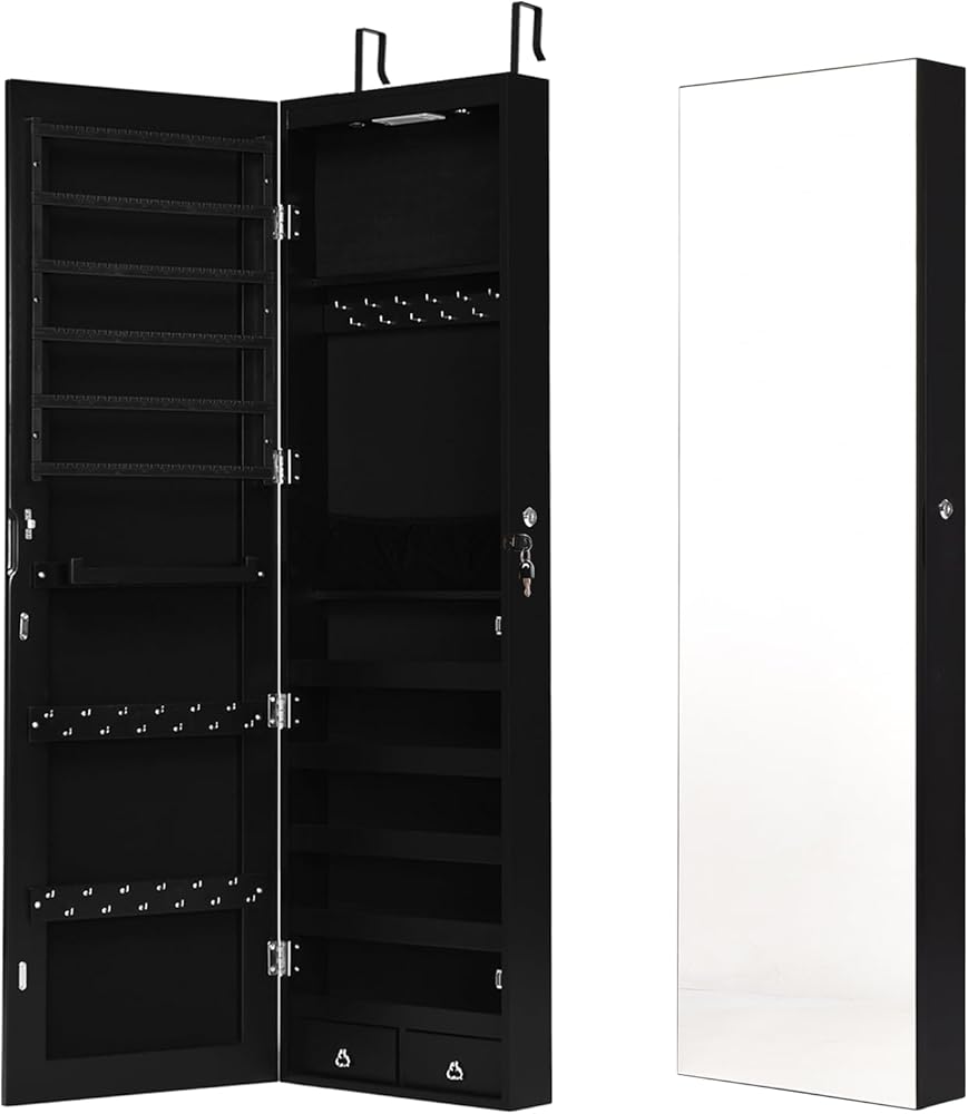 COSTWAY Wall Mounted Jewelry Armoire with Full Length Mirror & 2 LED Lights, Large Storage Capacity, Lockable Mirror Jewelry Cabinet for Women Girls (Black)