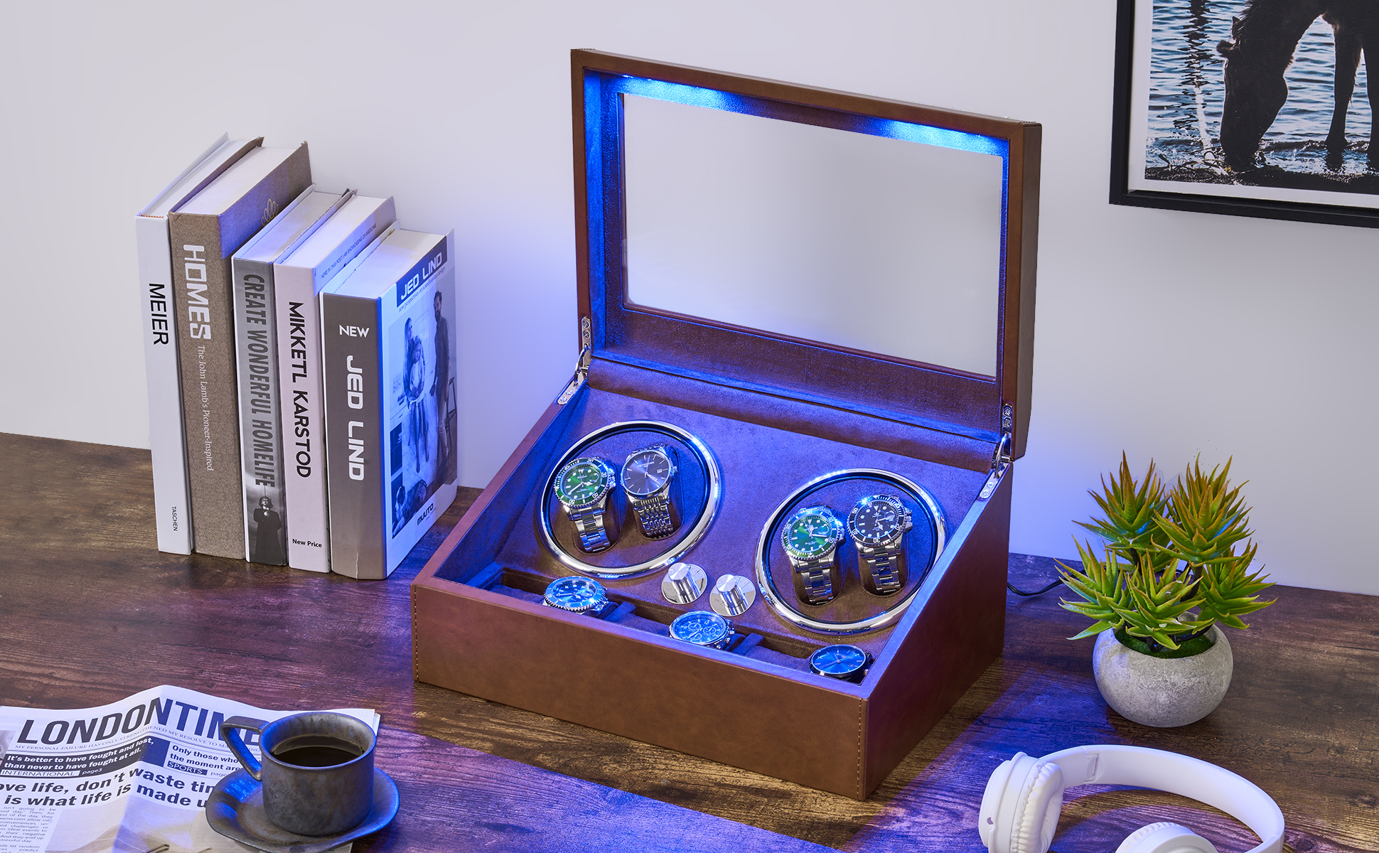 ANWBROAD Watch Winder for Automatic Watches 4 Watch Rotator and 6 Extra Storages with Super Quiet Mabuchi Motor LED Backlight Watch Turner Watch Shaker 5 Rotating Modes Gift USB Charging UJWW002G