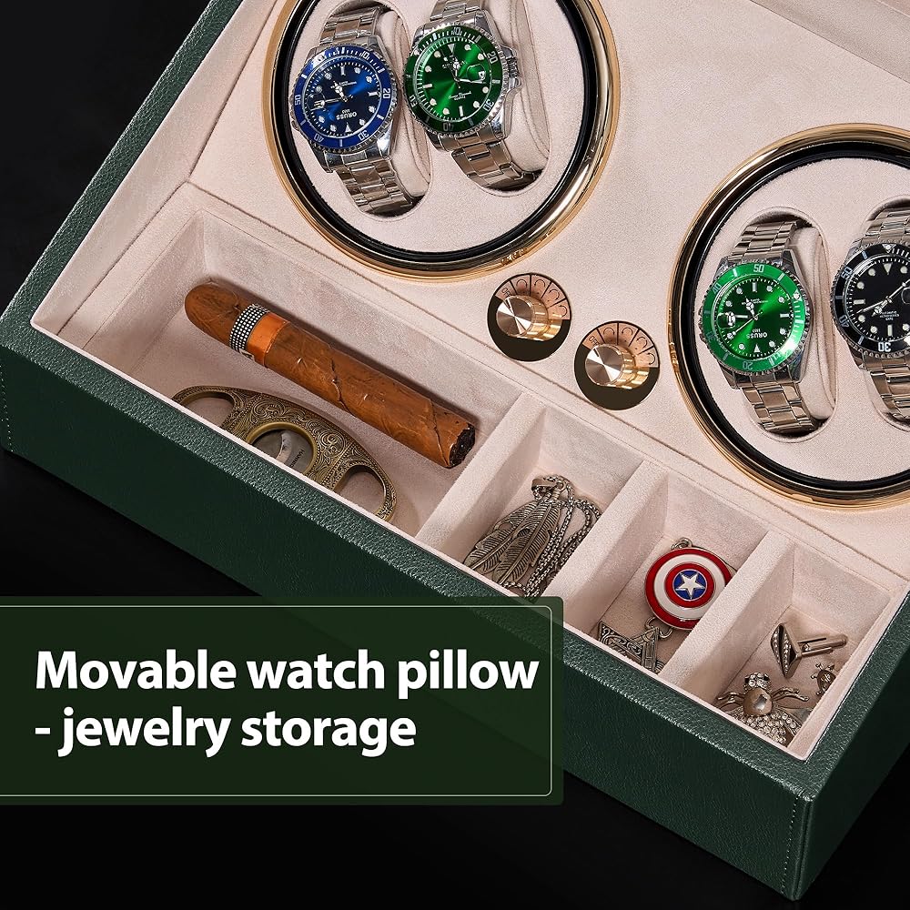 4+6 WATCH WINDER: 4 winding slots and 6 storage slots for organizing your watches. 4 watch pillows with pillow rings, suitable for watches of different girths. 6 movable watch pillows can be used as jewelry boxes to store jewelry. 2 motors can operate separately, selecting different modes while meeting different watches