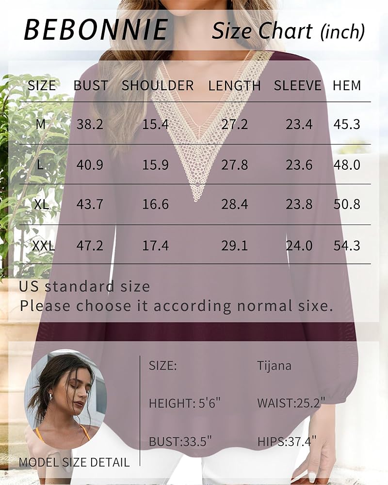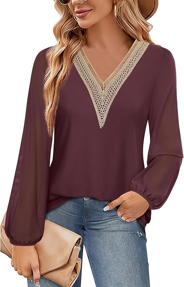 【Lace V Neck】Featuring a lace border V-neck, bell long sleeves, and a loose tunic style, this blouse exudes a elegant and stylish look.