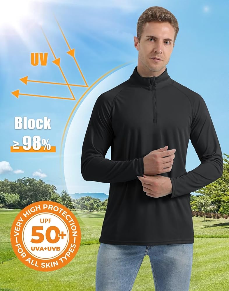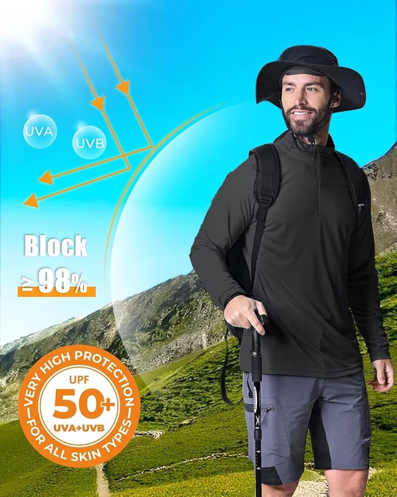 [UPF 50+ Sun Protection] UPF 50+ means these sun shirts for men can block 98% of UV rays (both UVA and UVB), full upper-body coverage without applying sunscreen all over your body. Keep you away from skin cancer, heat exhaustion, sunburn and sunscreen sweat