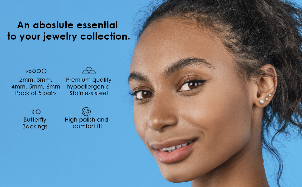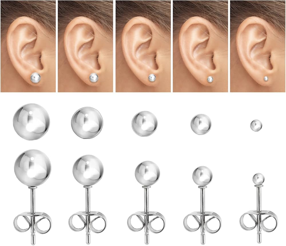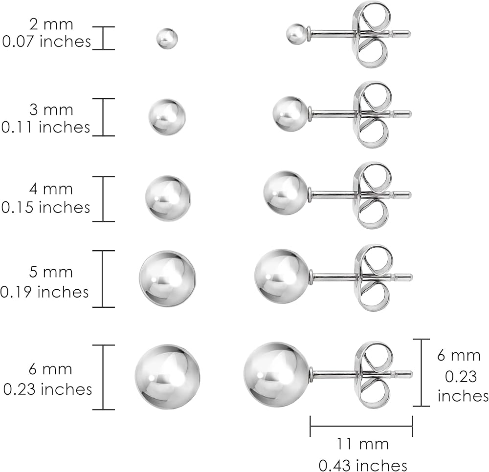 5 PAIR SET – This fashion earrings set displays 5 Pairs of 2mm, 3mm, 4mm, 5mm & 6mm polished bead ball stud earrings. They will fasten with butterfly backs that designed to fit comfortably and securely. The back pin for all 5 pairs of earrings is 10mm. It's perfect for those who have multiple piercing, you can wear more than one size/set at a time. Simple, yet elegant and classy it will be a perfect addition to your jewelry collection.