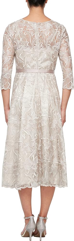 - Midi length embroidered A-line dress with illusion neckline, 3/4 sleeves and tie belt