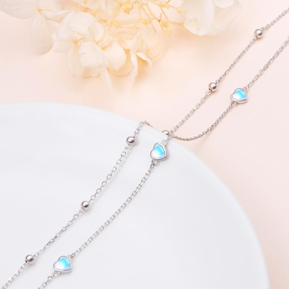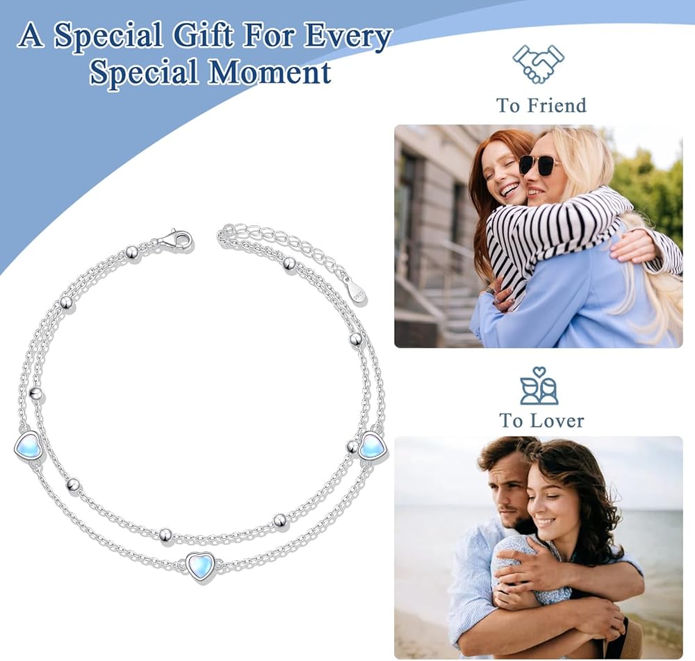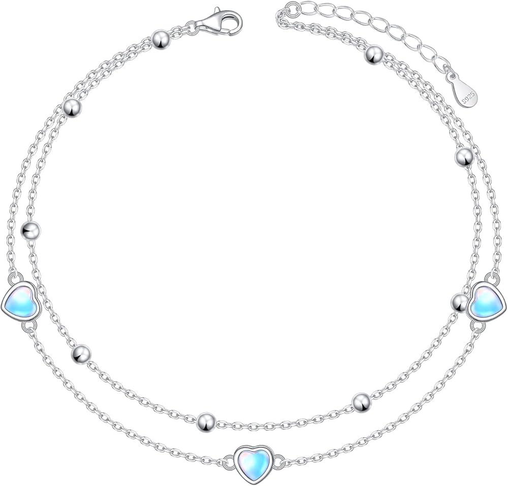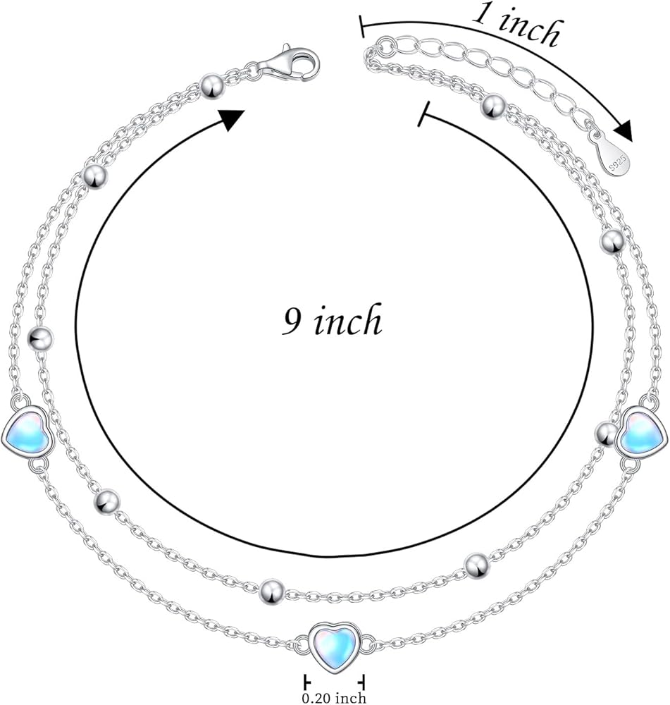 💕Sterling Silver Ankletl💕 This moon star sterling silver layered anklet made of 925 sterling silver and decorated with shiny blue moonstone,White Rhodium Plating added to enhance shine, pink enamel craft, Nickel-free, safe and comfortable to wear for long time, not easy to rust,best silver anket for women.