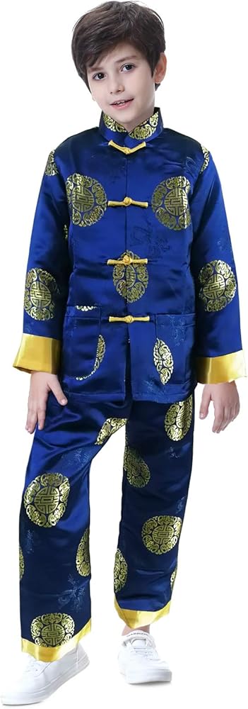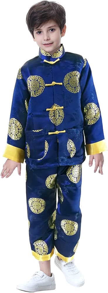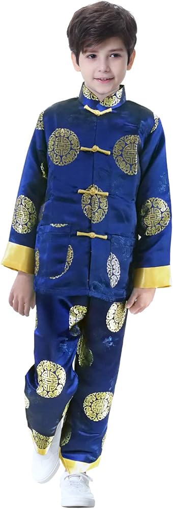 Chinese traditional matching set for boy made of brocade fabric with auspicious Chinese traditional symbol of happiness and longevity.