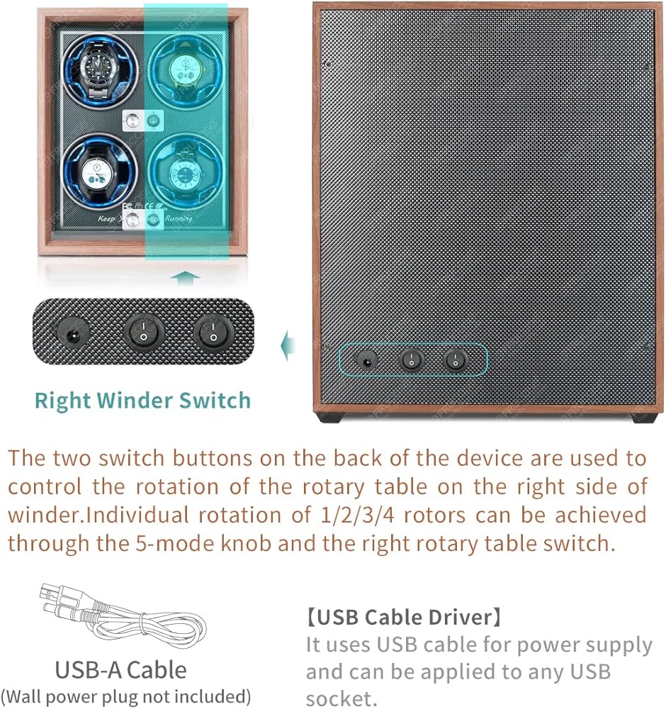 【Working Model Setting】This device is powered by USB cable. It has 3 directions (clockwise,counter-clockwise,both) and 5 rotation modes , you can choose right modes for your beloved watches and make it work more accurately.Its front panel has two light control switches, and the rear panel has two right rotor control switches.Refer to the manual for detailed description.