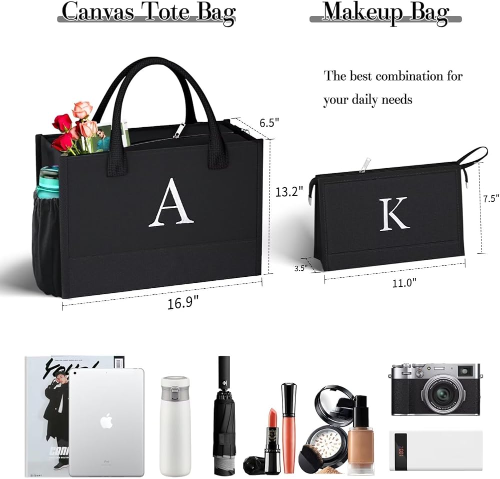 【LARGE CAPACITY & 2 POCKETS】Our initial beach bags measure L16.9" x W6.5" x H13.2", large enough to hold your daily accessories. The tote bag thoughtfully designed with a side pocket and an interior pocket, providing convenient storage for items like water bottles and small essentials. With a removable bottom support makes our bag stand upright and firmly. The makeup bag measures L11" x W3.5" x H7.5", which can accommodate a lot of cosmetics, making it perfect for your daily makeup and tools.