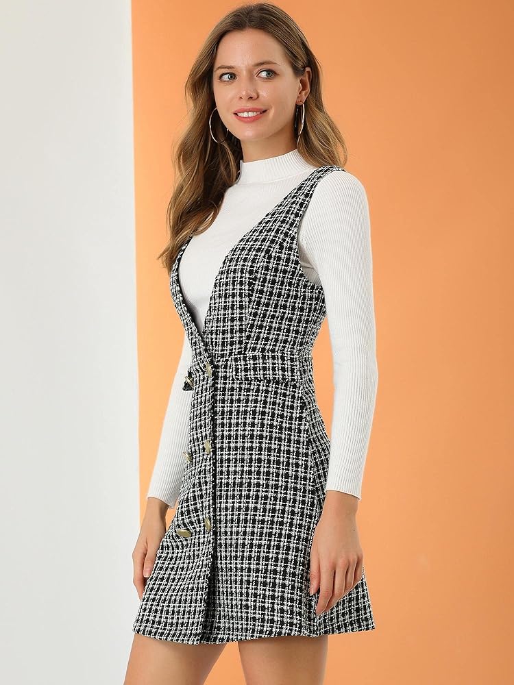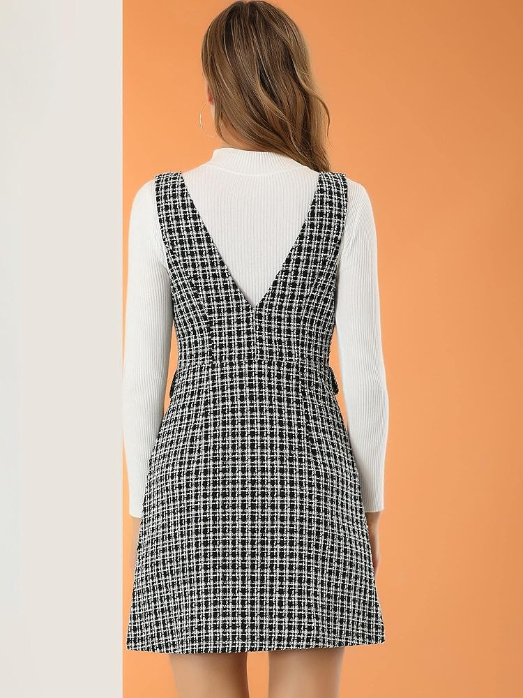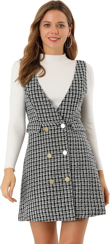 Allegra K Women's Elegant Vintage Button Front V Neck Plaid Tweed Overalls Pinafore Dress