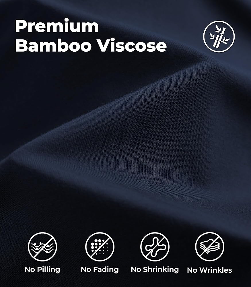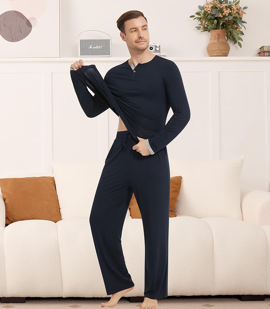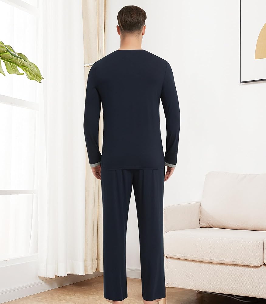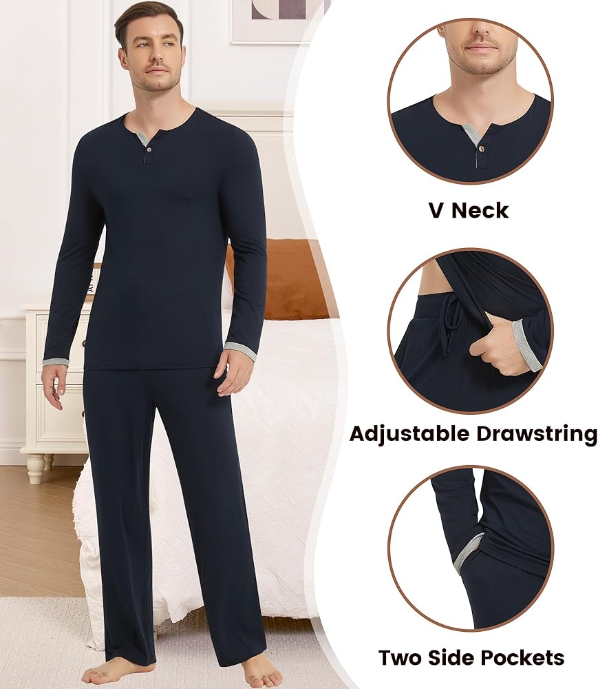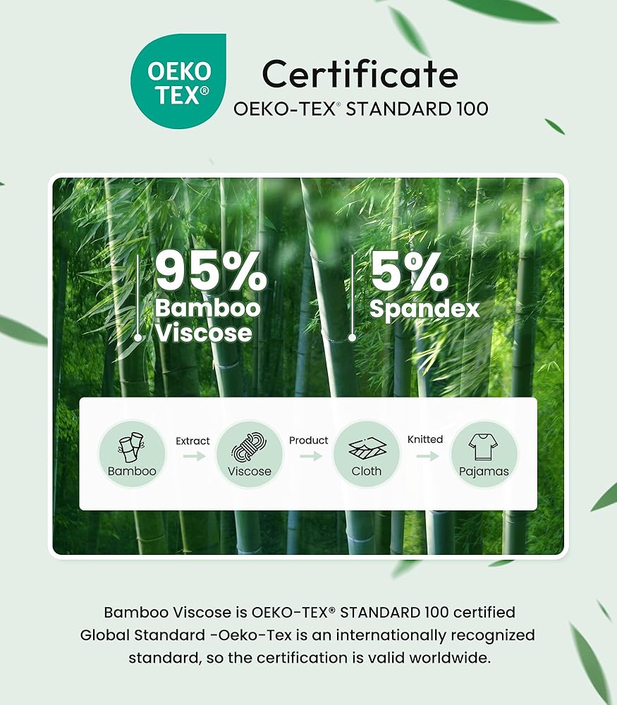 [Viscose made from Bamboo]: Mens pajama set is made of 95% Viscose made from Bamboo and 5% Spandex. The super soft and breathable bamboo fabric gives you a comfortable wearing experience.
