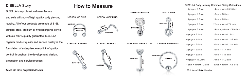 [Size] The Screw hole size: 14g(1.6mm), Balls Size: 5mm; Straight barbell size: 14g(1.6mm), bar length: 12mm(1/2"), 14mm(9/16"), 16mm(5/8"), 18mm(3/4")