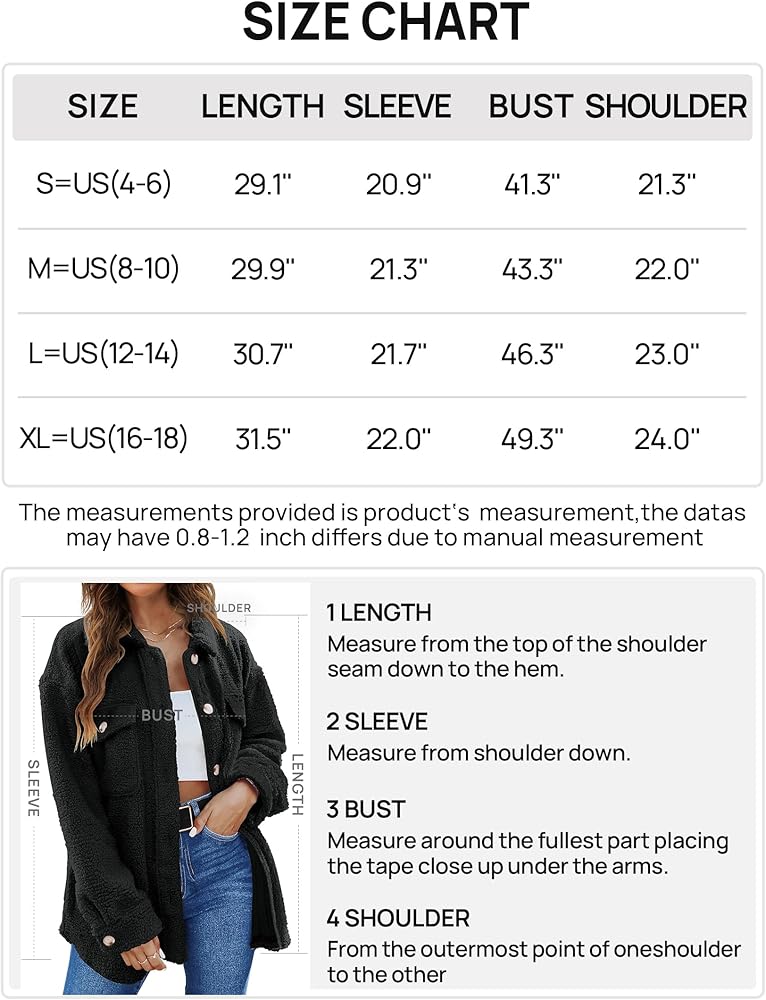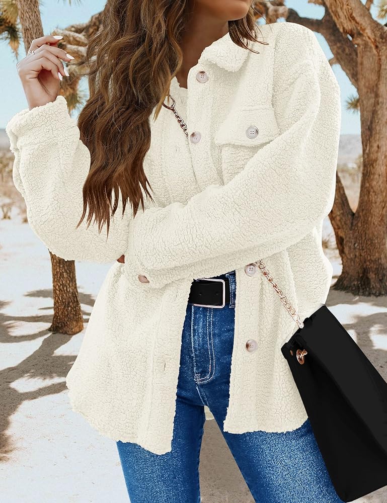 Features: This sherpa jacket shacket features long sleeve, button down closure, laper collar with pockets, solid color, open front, boyfriend style, casual and relaxed fit.