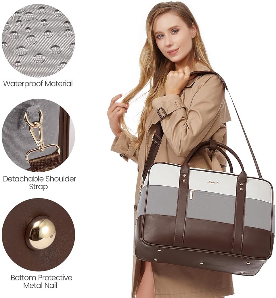 [DURABLE & VERSATILE WEEKENDER BAG] Our weekender travel bag is made of scratch-resistant, waterproof material(excluding the zipper), Allows you to walk in light rain for short periods of time and keep your belongings dry. Its sturdy design includes shaping ribs and metal spikes at the base for standing
