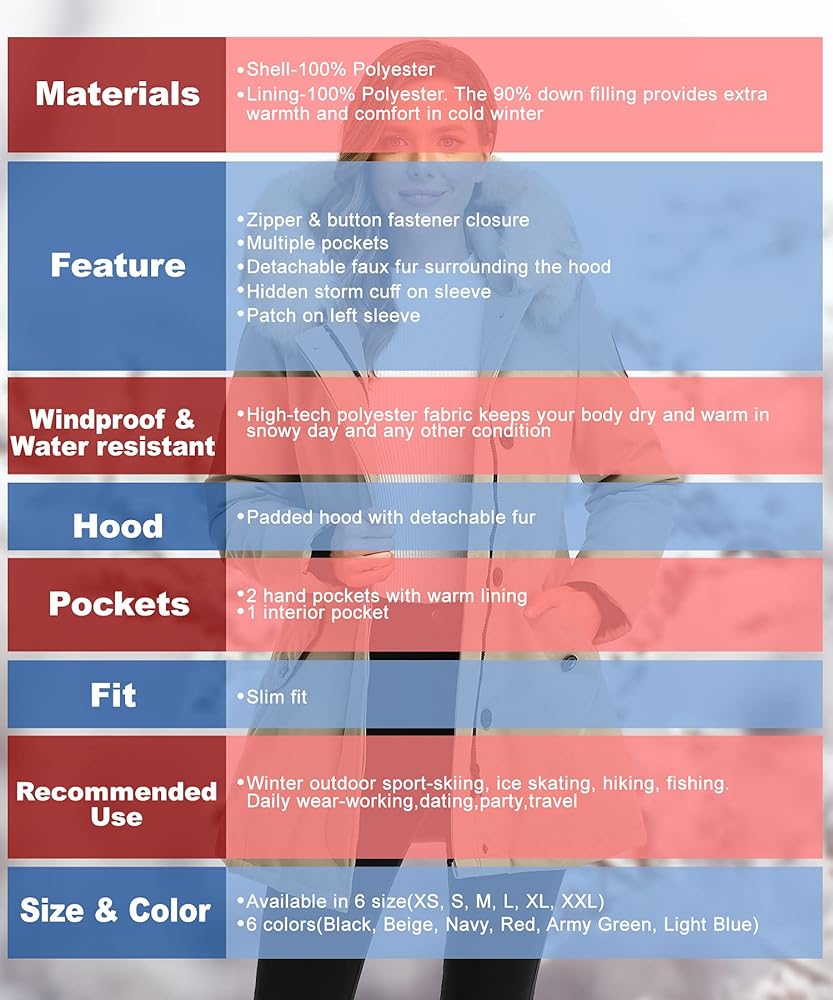 Our ladies' padded parka with hood is easy to pair with dress, skirt, sweater, T-shirt, jean, leggings and all kinds of shoes in winter.