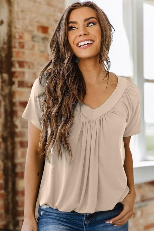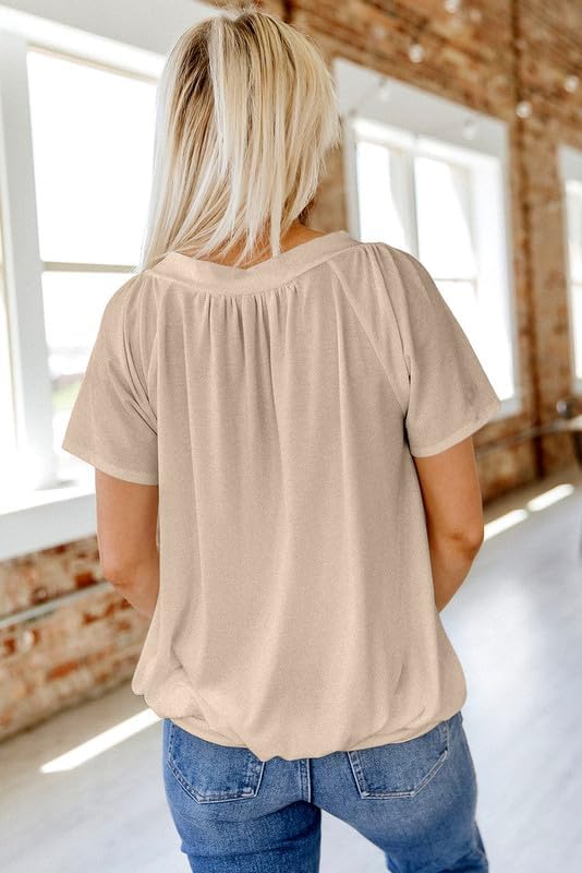 Feature: Short Sleeve Shirts, Solid Color, Loose Fit, Basic Tunic Tops, V Neck, Casual Chic Style.