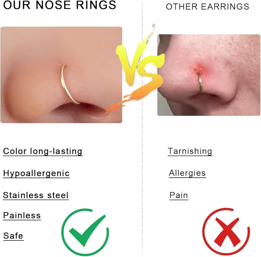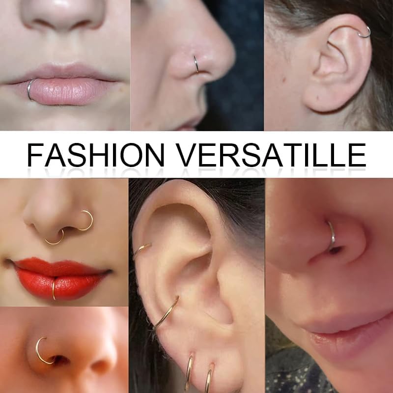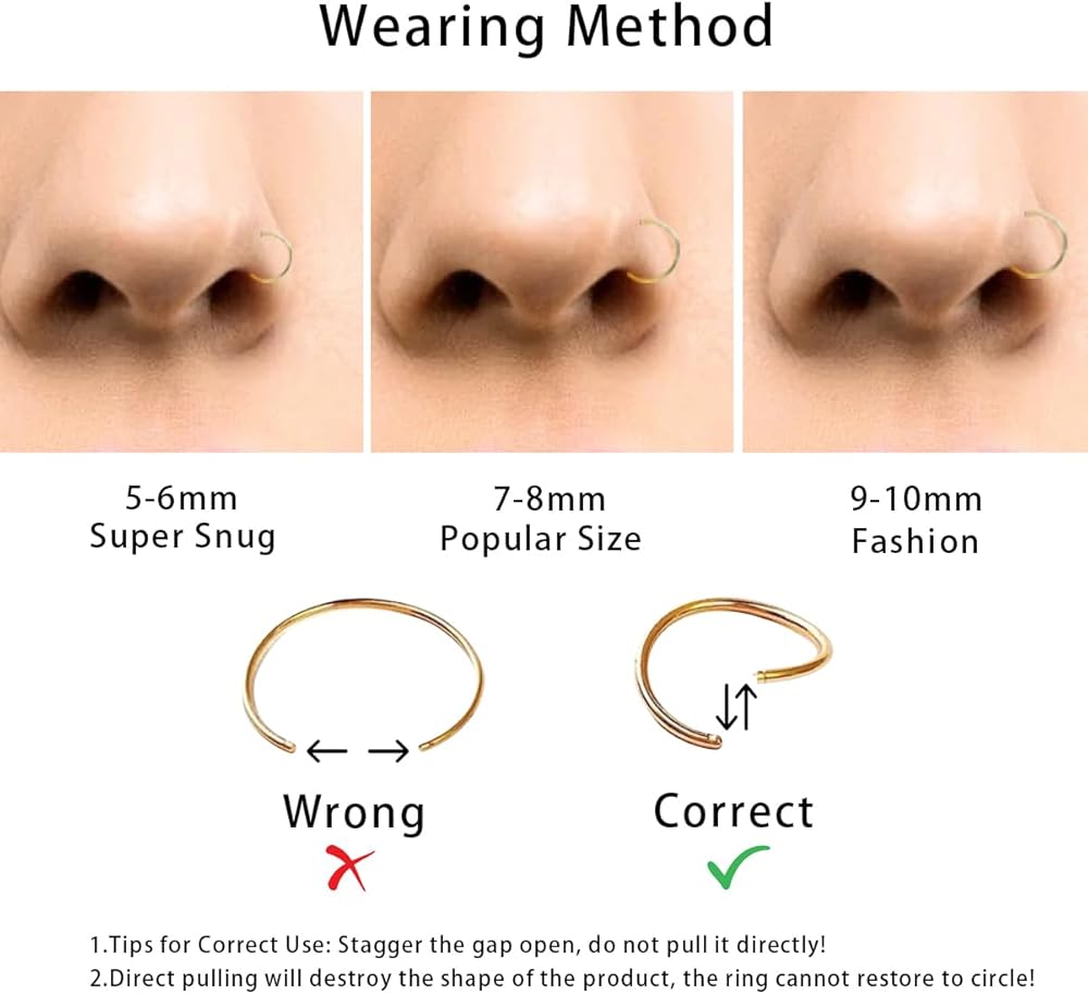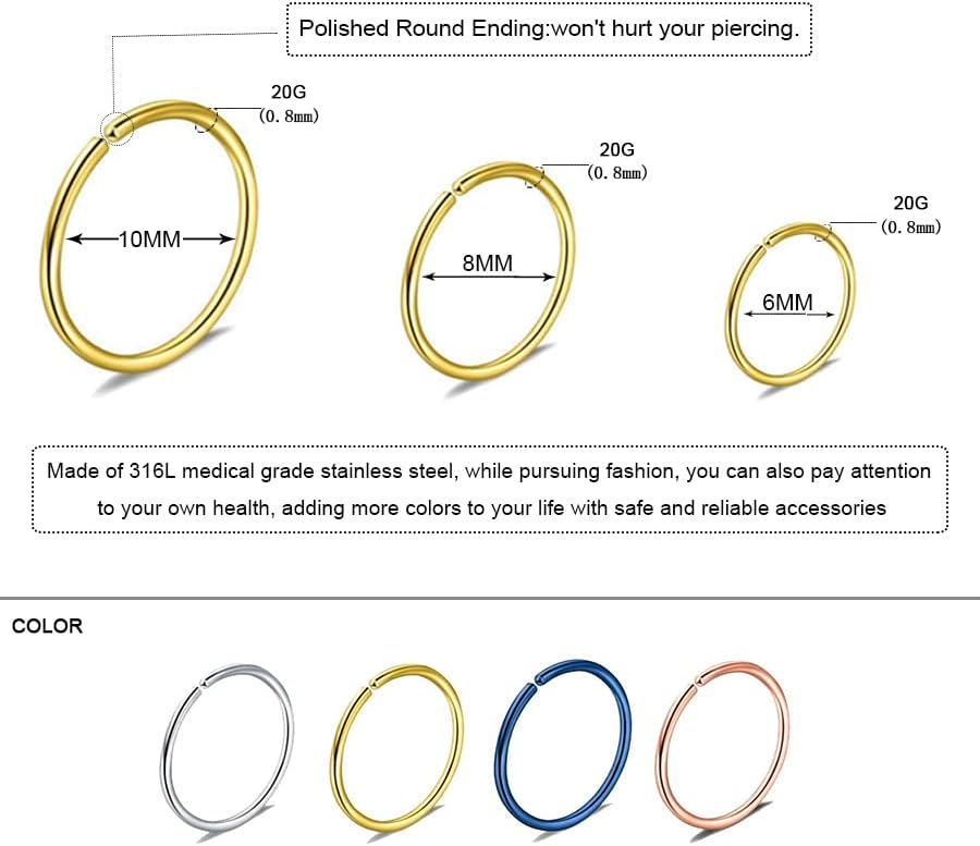【Nose Ring Size】- Gauge Size:20G (0.8mm),Nose ring hoop inner diameter: 6/8/10 mm, High-polished Finishing and Electroplating, Super Smooth and Comfortable to Wear. Convenient open design, you can adjust the tightness as you like.