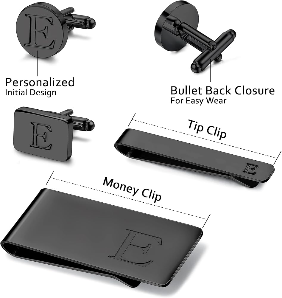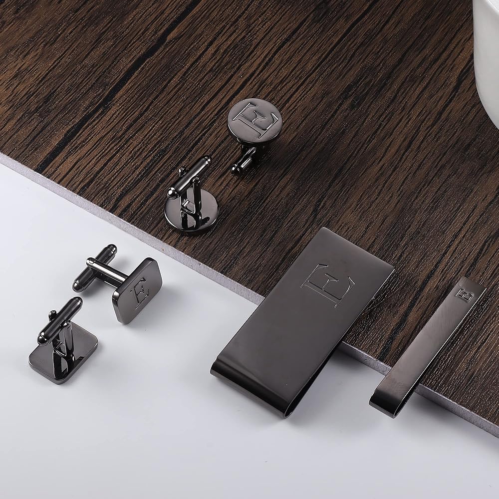 【TRENDY PACK】 6 PCS Set of Modern Style Men's Jewelry, Each Set Includes 2 Pair of Cufflinks, Matching Tie Bar and Money Clip with Engraved Letters. Affordable Price and Quality Workmanship, Great Idea for Wedding - Groomsmen with Matching Jewelry Details.
