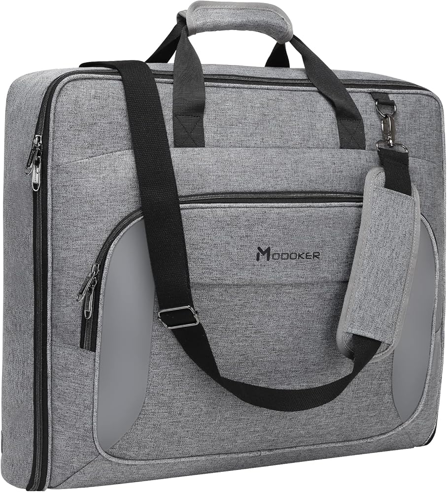 WATER-RESISTANT GARMENT BAG: Designing with Modoker custom logo zipper, Features Water-resistant & Fray-resistant Nylon with leather on the front makes this garment bag looks stylish that makes sure the luggage lasting longer. Garment suitcase has a handle to carry with your hand, Plus a detachable shoulder strap is made with padded to make this garment bag fits your shoulder well