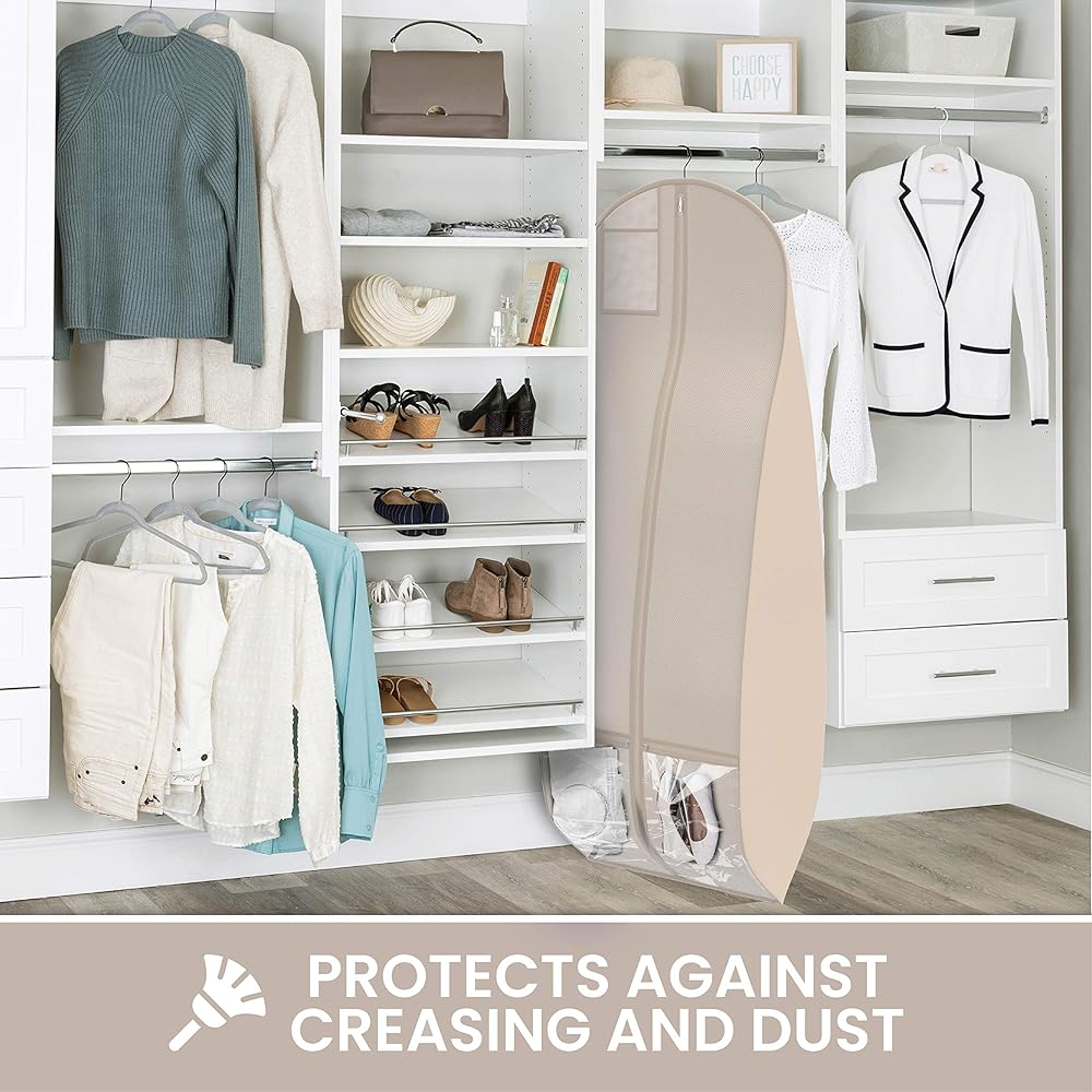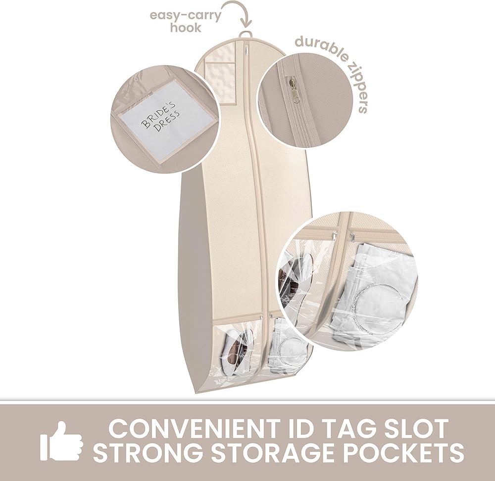STORE AND ORGANIZE: This must have long gown garment bag has a clear vinyl pouch that allows for easy labeling, helping you keep your dresses perfectly organized. In addition, the sturdy center zipper and the reinforced hanging hole assures unmatched durability and maximum protection.