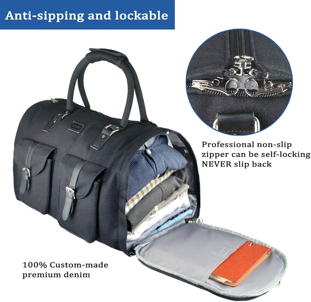 Made by premium 100% custom-made denim, high quality hardware accessories and fabric leather, the carry on luggage garment bag orients upmarket and fashion.