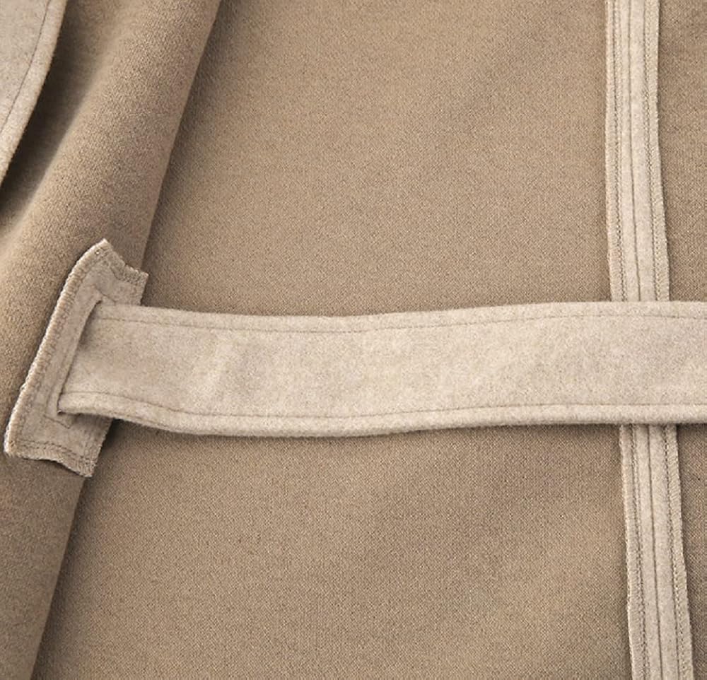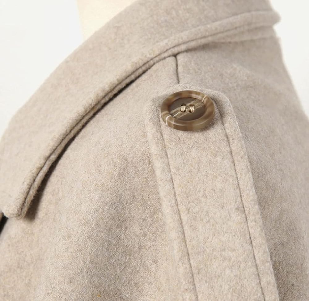 - Features: double-breast closure, batwing sleeve, built-in belt, solid color, short length