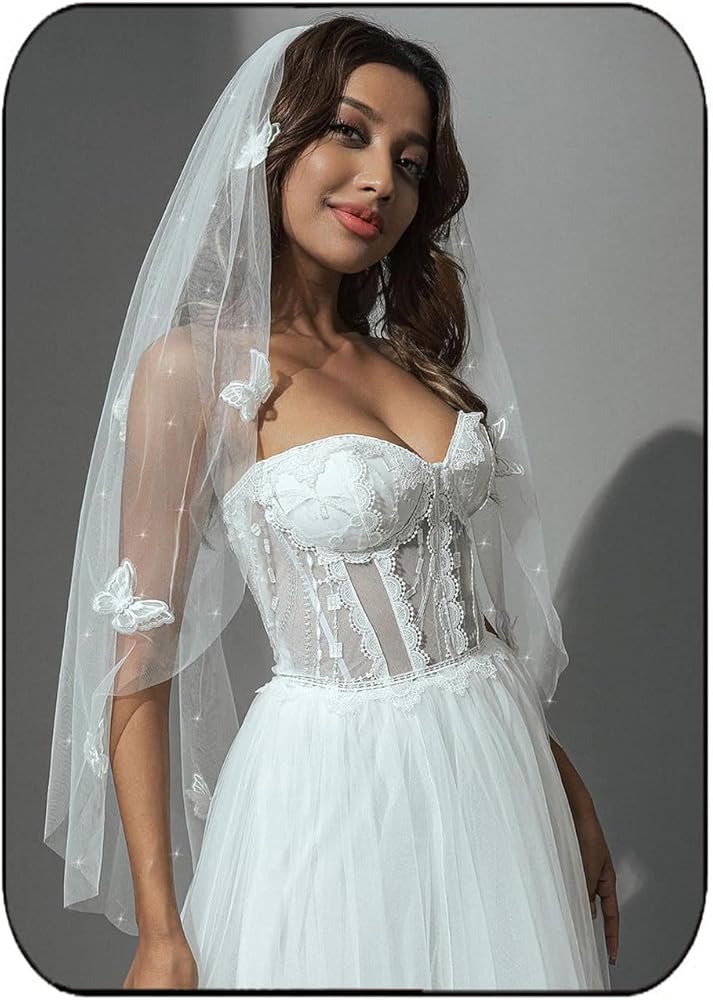 HEREAD Short Bride Wedding Veil with Butterflies Fingertip Length Sparkly Bridal Tulle Veils Hair Accessoies with Comb