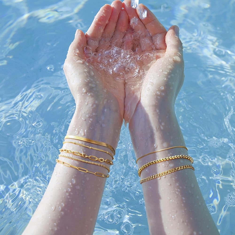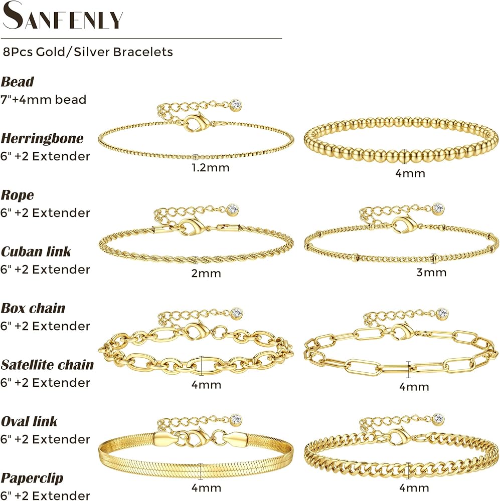 【Gold Stackable Bracelets】An order includes 8 pcs bracelets gold, including beaded bracelet, herringbone bracelet gold, rope chain golden bracelet, cuban link gold chain bracelet women, box chain women's bracelet, satellite chain gold bracelet non tarnish, oval gold link bracelet and paperclip women gold bracelet. These bracelets bulk are perfect for dressing up any outfit, jeans to dresses, evening or office, they will work with any style.
