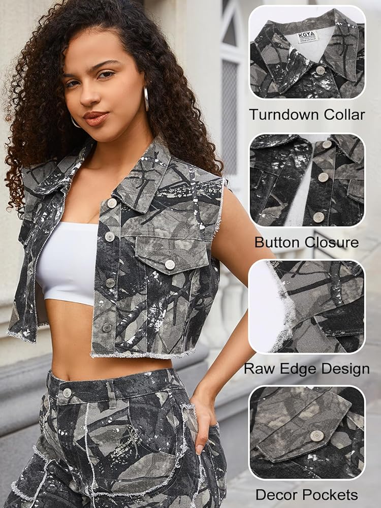 Season And Collocation: Durability and long-lasting KGYA camo jean vests are perfect for spring and summer. You can wear the baselayer tops (such as tube tops or tank tops) under the cropped jacket, or wear it alone as a vest. Ideal for matching with sexy shorts, cargo shorts A-line skirts or jean skirts.