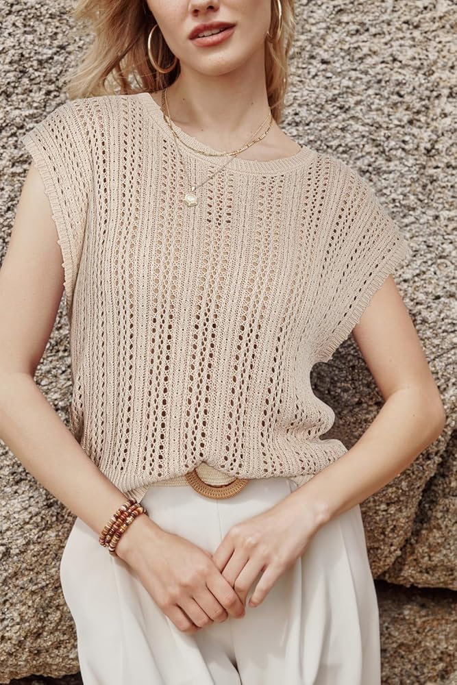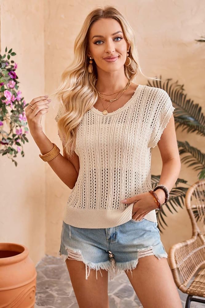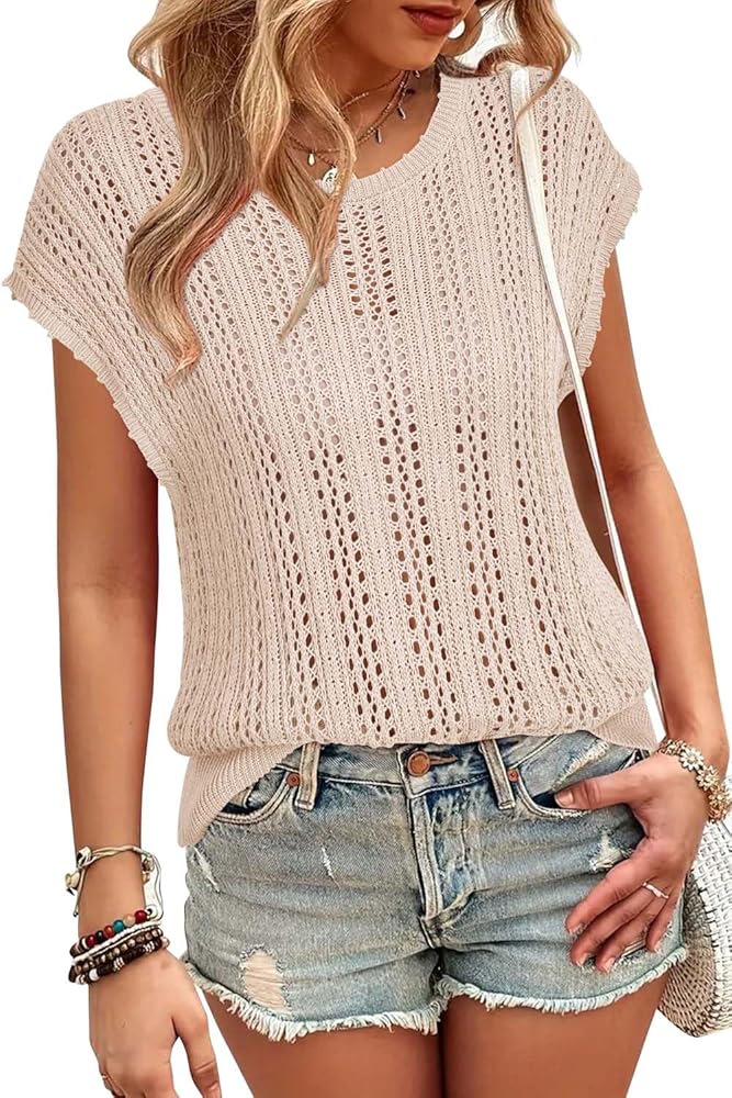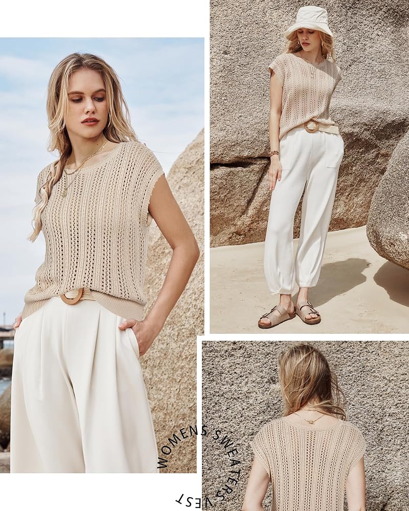 SWEATER VEST WOMEN: Featured with crew neck , cap short sleeve, hollow out, crochet knit, ribbed hem, this womens tank top's versatile and chic design make it an essential addition to any fashion-forward women's wardrobe
