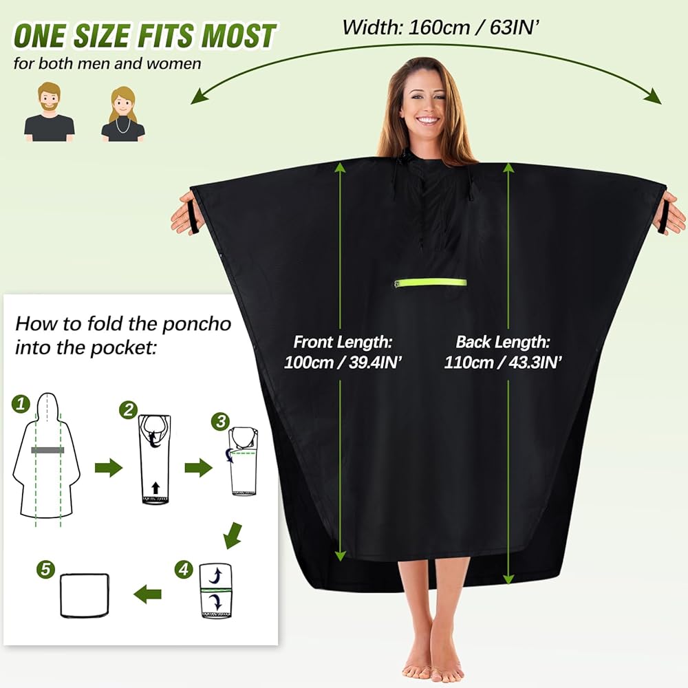 【COMFORTABLE AND SOFT】: This adult ponchos feels soft and comfortable, the size is suitable for both men and women, the collar is added with a zipper and hook-and-loop fastener to make it easy to put on and take off, the windproof lanyard at the cuffs and the snap buttons on both sides play a role in fixing the poncho, so you don't have to worry about your poncho being blown up and drenching your clothes even when it's windy weather.