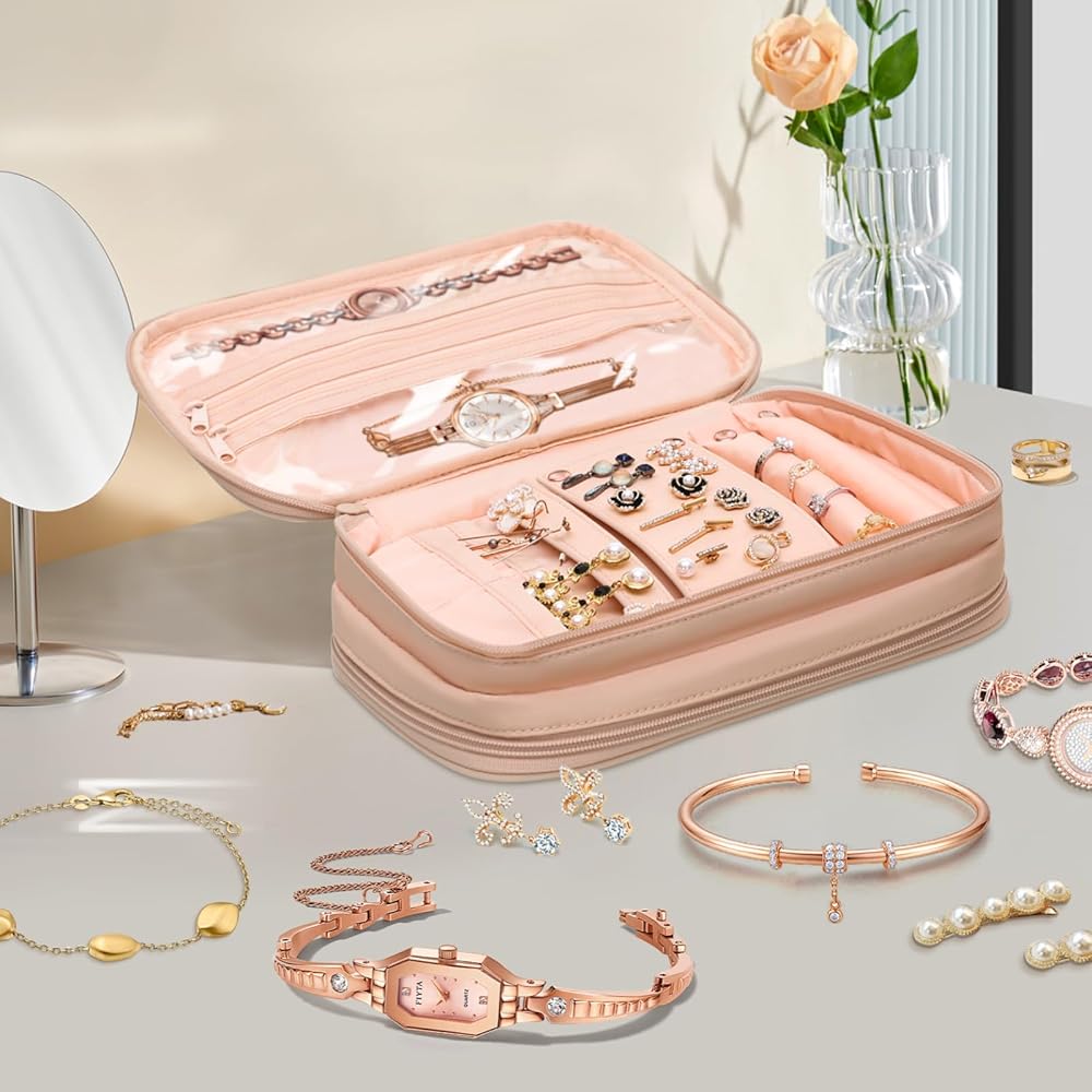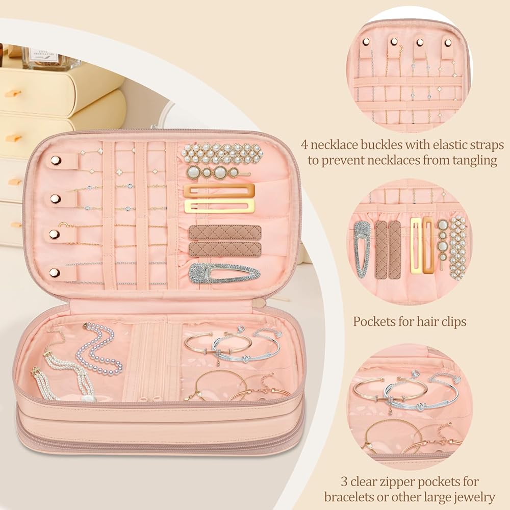 Large Capacity : 2 rings rows, an earring panel for stud earrings, an earring strap and 6 pouches for dangle earrings, 4 necklace buckle with straps and pockets to keep necklaces or chains from tangling. Five clear PVC zipper pockets in different sizes are specially designed for precious watches, pearl necklaces, bracelets and other large jewelry. It's transparent and visible to find your jewelry quickly.