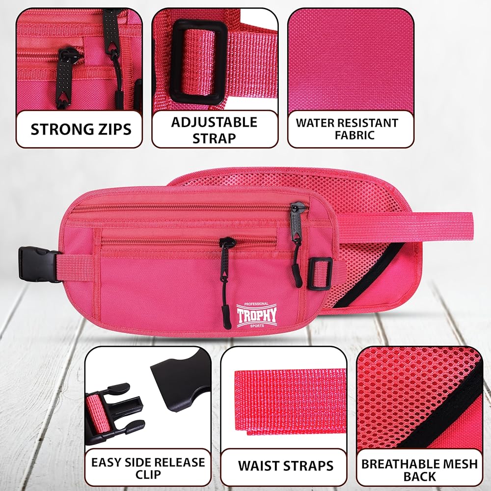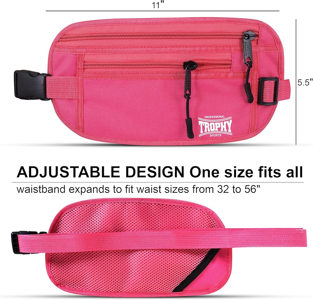 Trophy Sports Money Belt RFID Blocking Money Belt - Slim Passport/Money Holder Pouch for Traveling - Small Hidden Undergarment Waist Wallets for Men and Women - Enhanced Security (Pink)