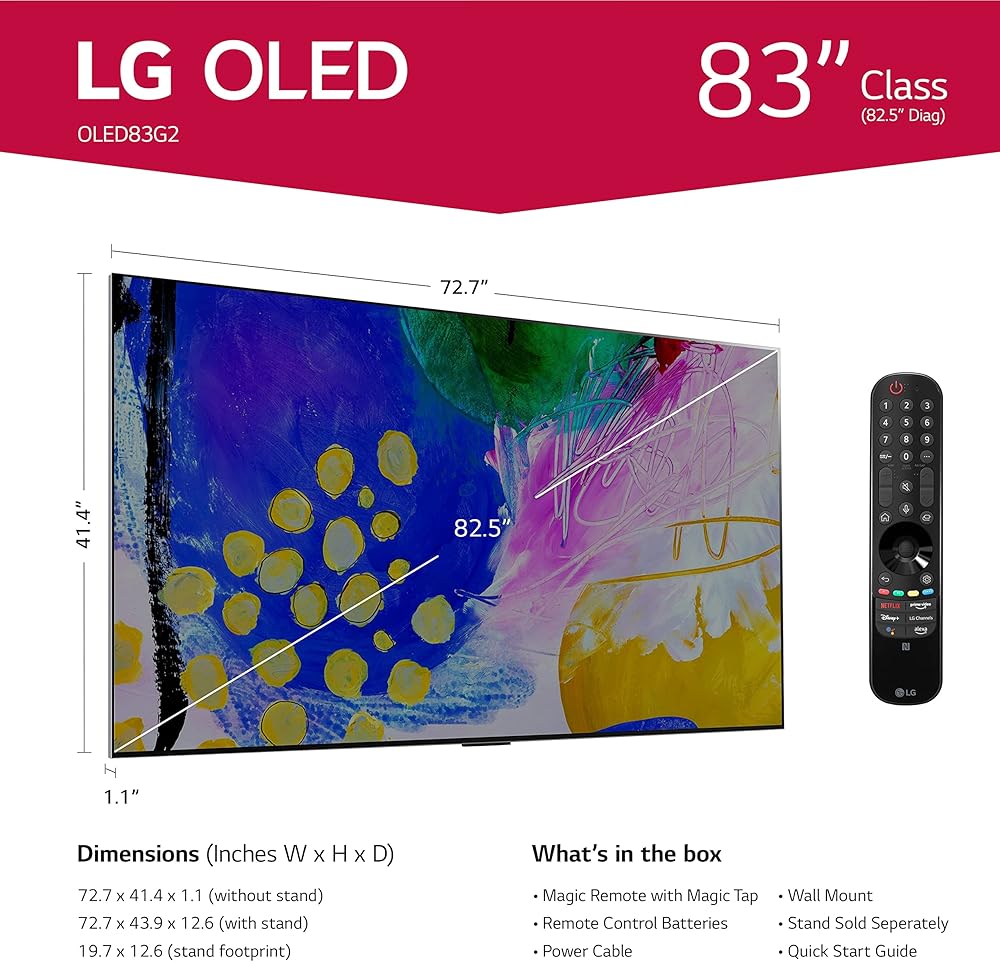 LG 83-Inch Class OLED evo Gallery Edition G2 Series Alexa Built-in 4K Smart TV, 120Hz Refresh Rate, AI-Powered, Dolby Vision IQ and Dolby Atmos, WiSA Ready, Cloud Gaming (OLED83G2PUA, 2022) (Renewed)