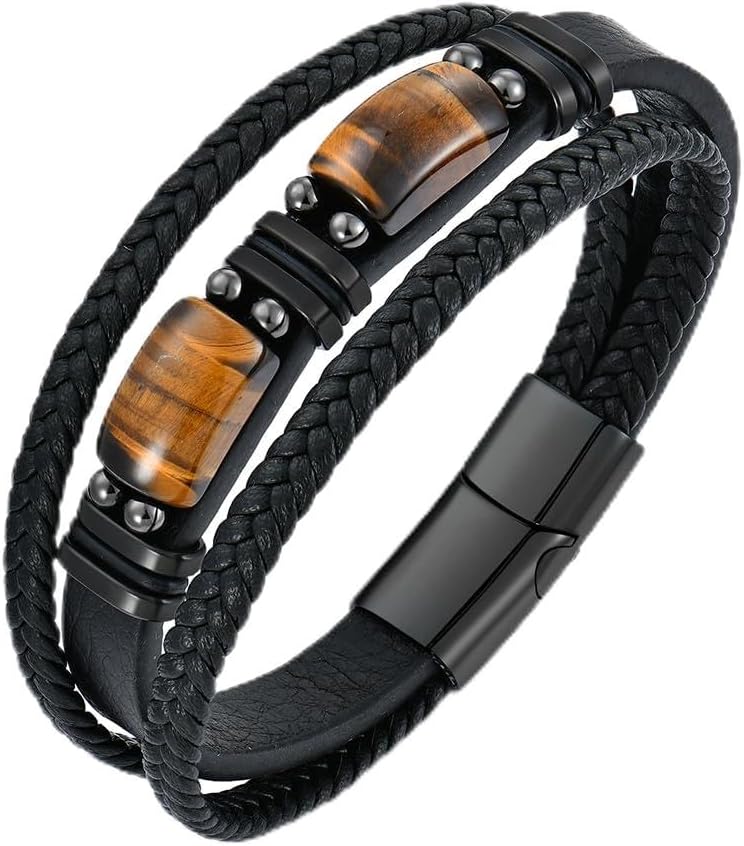 ✍EXCEPTIONAL DESIGN - This meticulously crafted accessory showcases a captivating blend of microfiber leather and two exquisite tiger eye stones. The combination of black leather and lustrous gemstones creates a striking, modern look that is sure to catch everyone's attention.