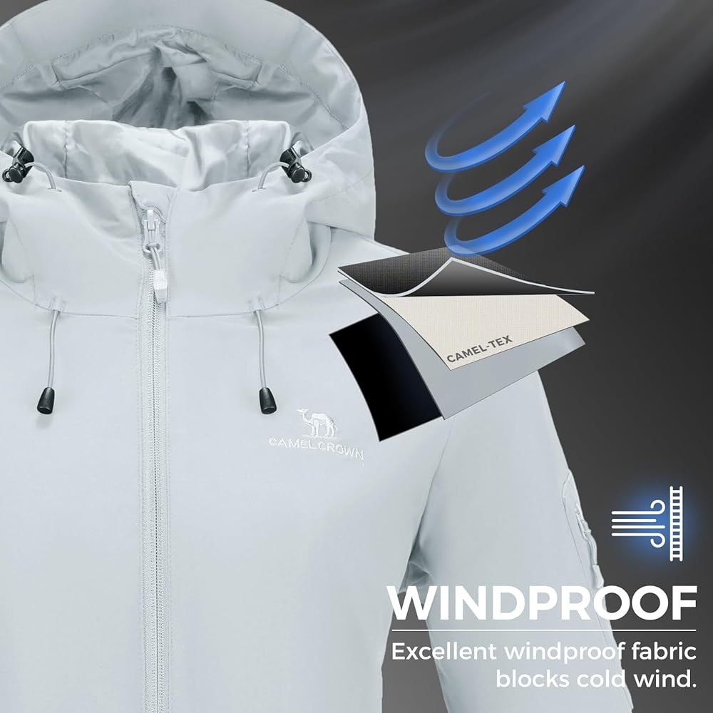 【Fashion Softshell Coat with Hood】—The rain coat has a detachable hood with hook and loop closure and zipper closure, you can easily remove it when it's not in use.