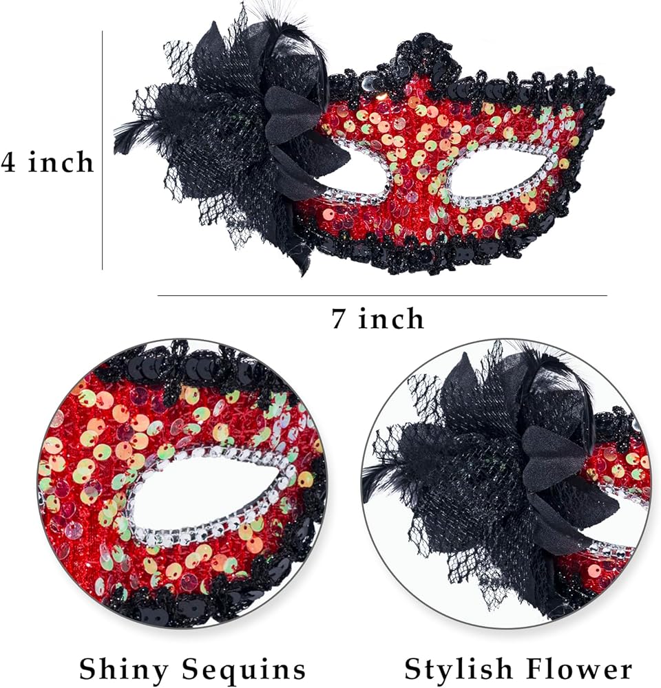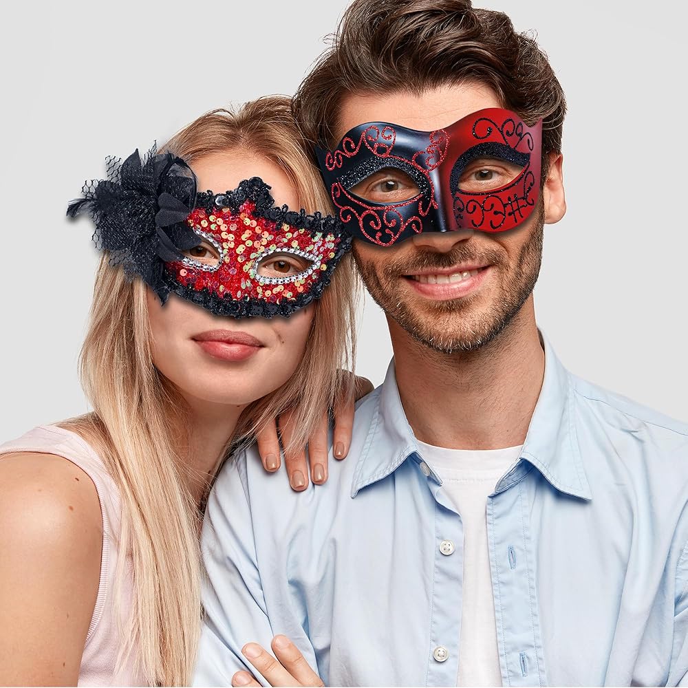 WELL-MADE MASK - The women mask with flower is made of premium ABS plastic with shiny sequins. Also made of ABS, the men mask is of Ancient Roman Greek mythlogical style.