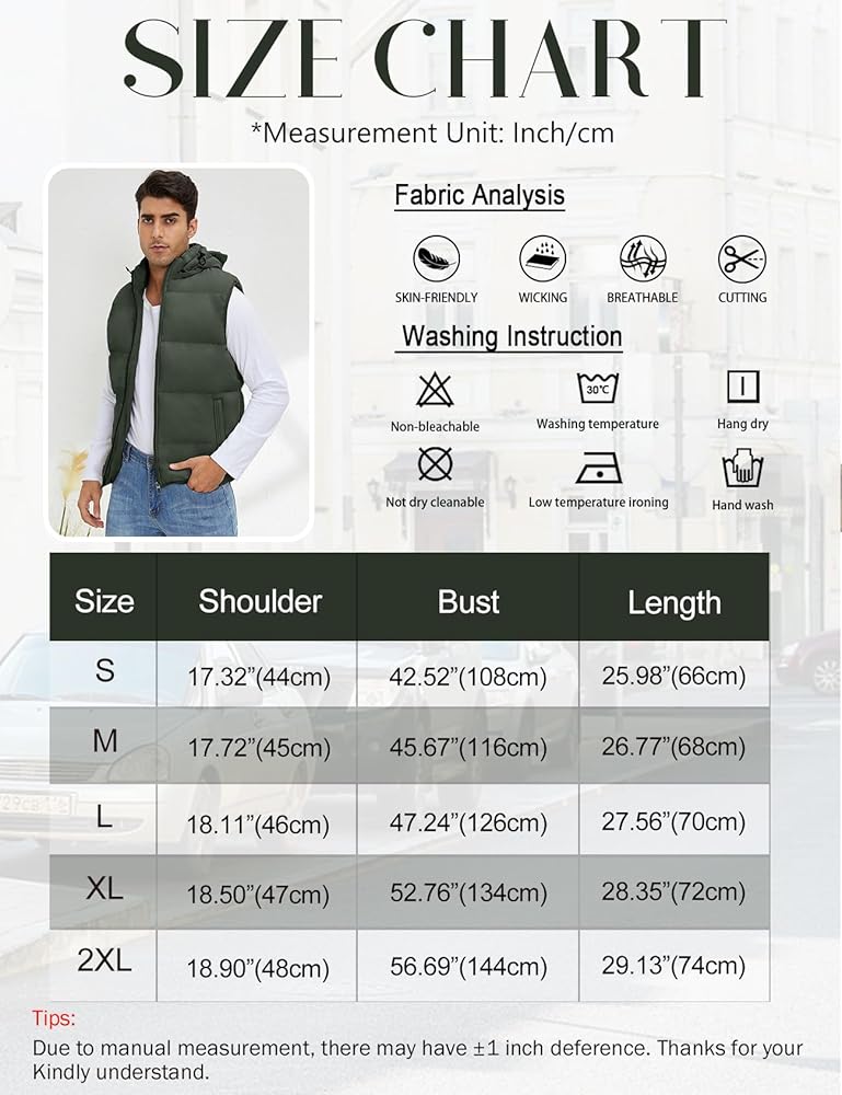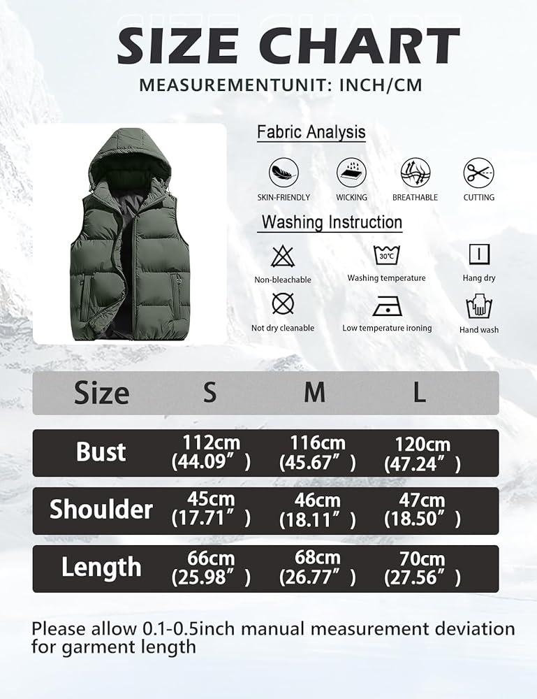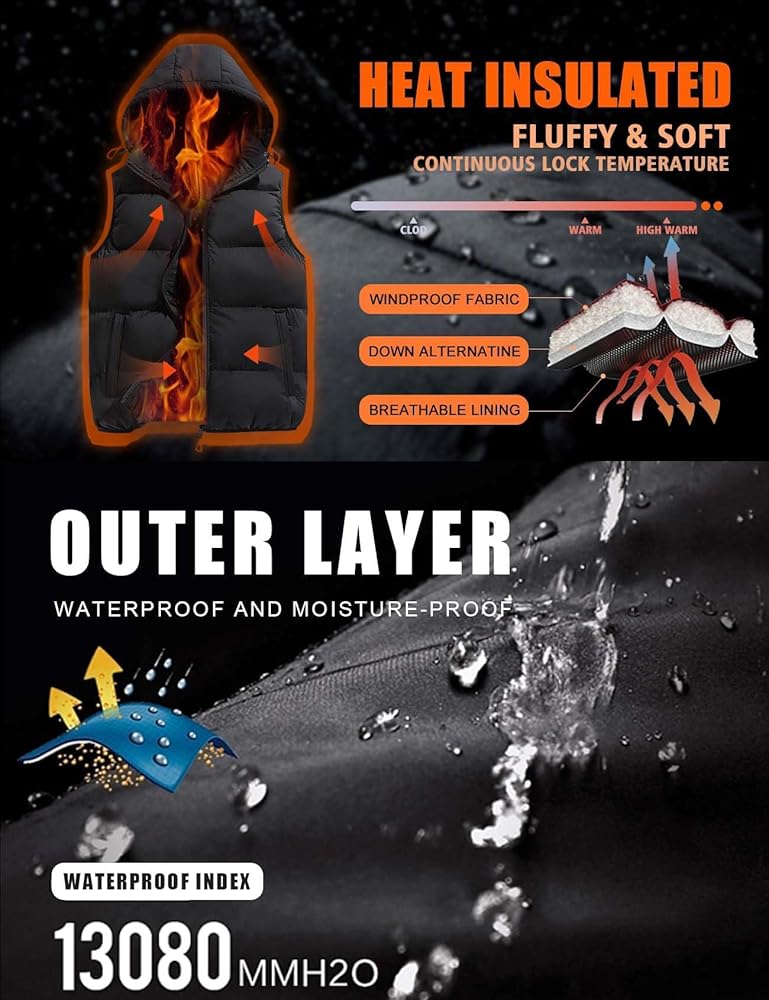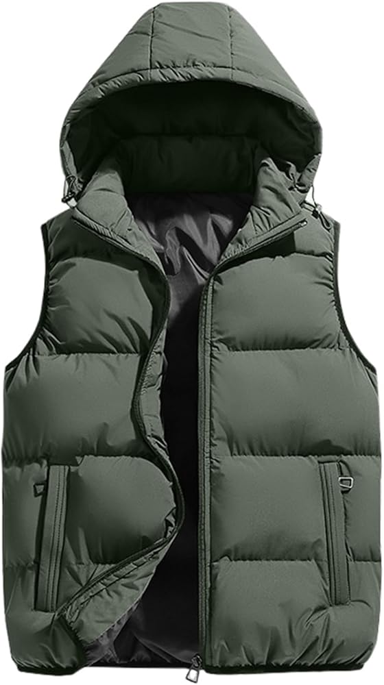 Design: Men's winter puffer vests, solid color, standard length, full zipper closure, slightly springy bands on the cuffs and hem, two side pockets with zippers, detachable hood with adjustable drawstrings which providing added protection when needed, with its padded design, this vest provides extra cushioning for a cozy fit, ensuring enough comfort during chilly days.